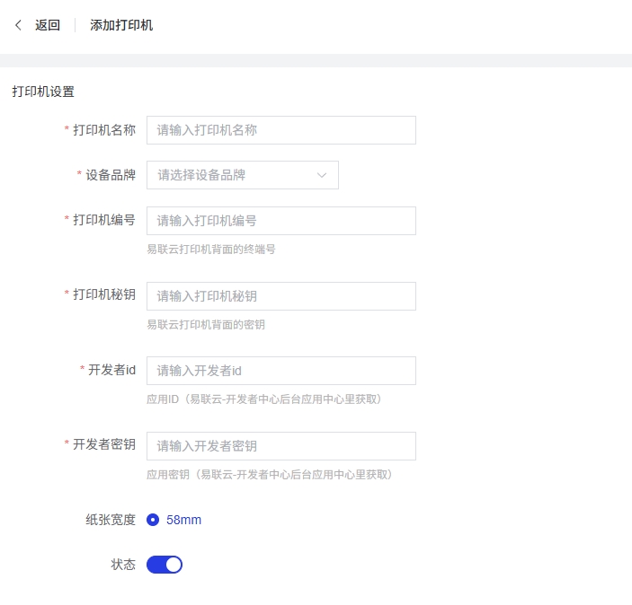 状态:开关按钮,控制打印机是否启用。