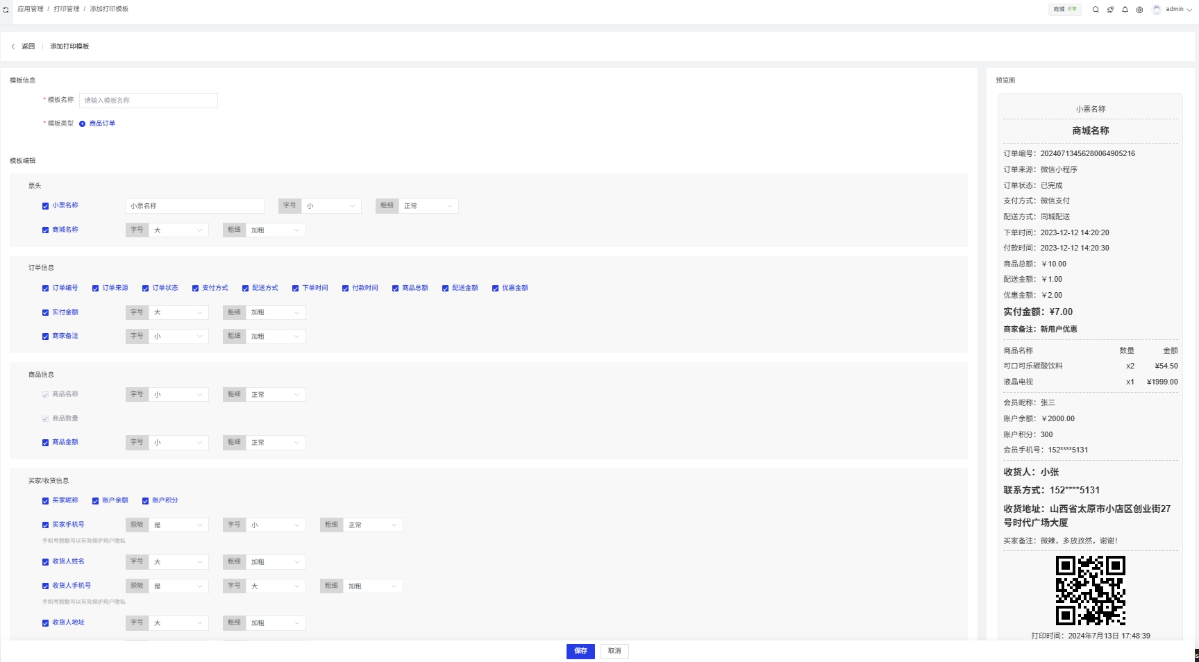 点击"添加打印模板"按钮,进入添加打印模板页面,页面包含以下设置项: