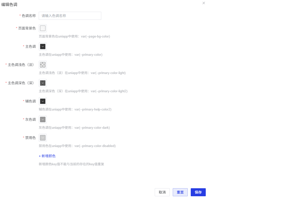在选择系统配色弹窗中,点击已有的配色方案或点击"新增配色"按钮后,将进入编辑色调界面。编辑色调功能包含以下配置项: