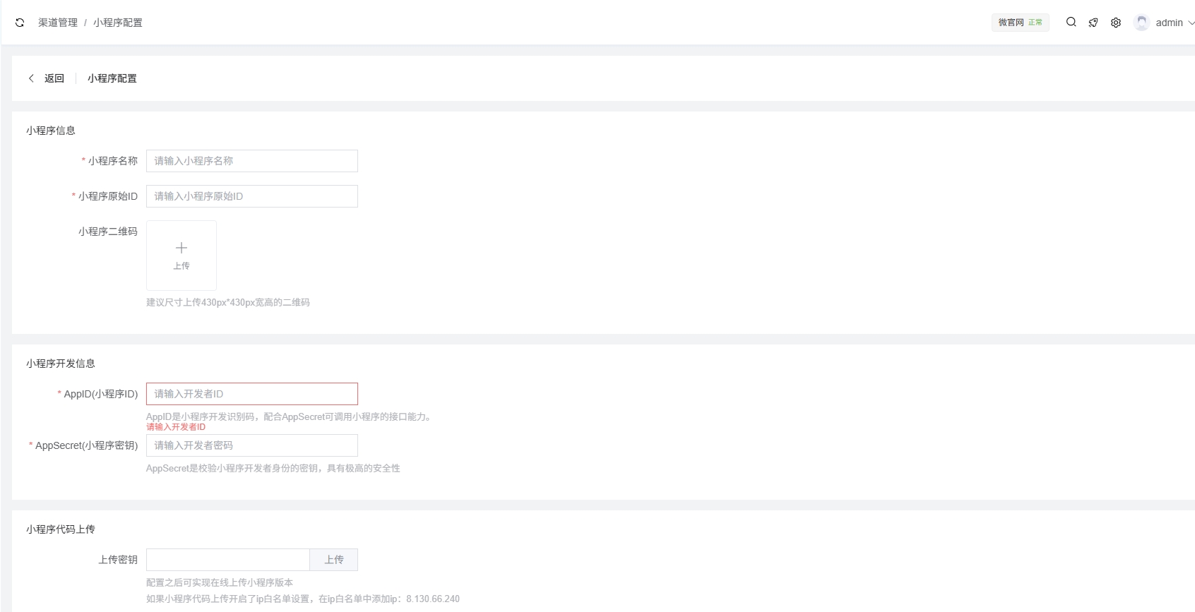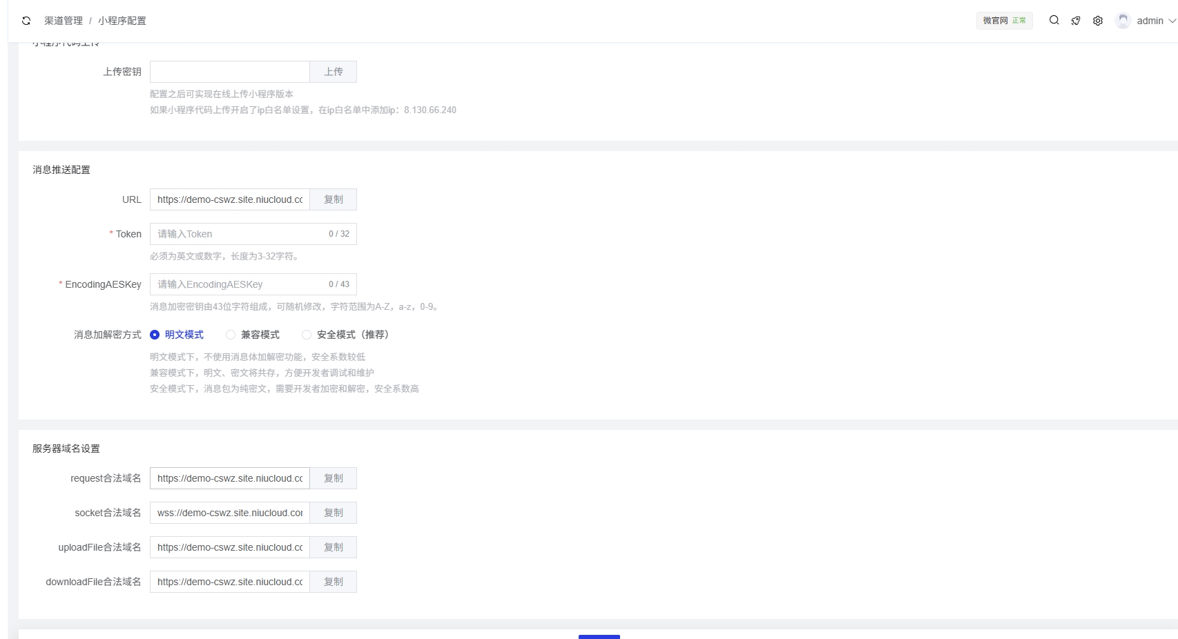 小程序配置页面包含详细的配置项,用于完成小程序的技术对接:
