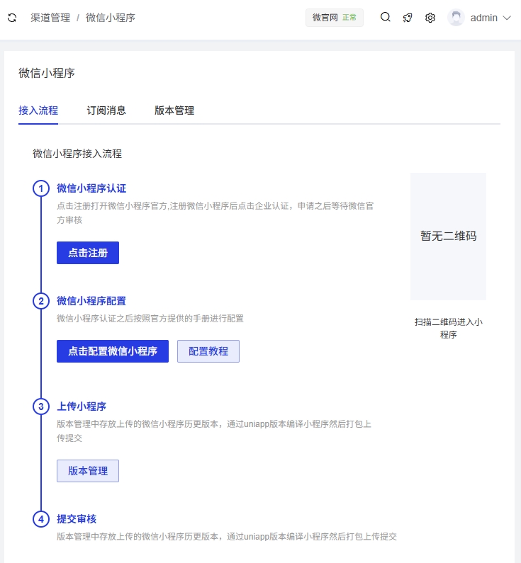 微信小程序模块用于管理系统与微信小程序的对接与配置,支持小程序认证、小程序信息配置、版本管理及订阅消息设置,帮助用户实现微信小程序的快速接入、开发和发布。