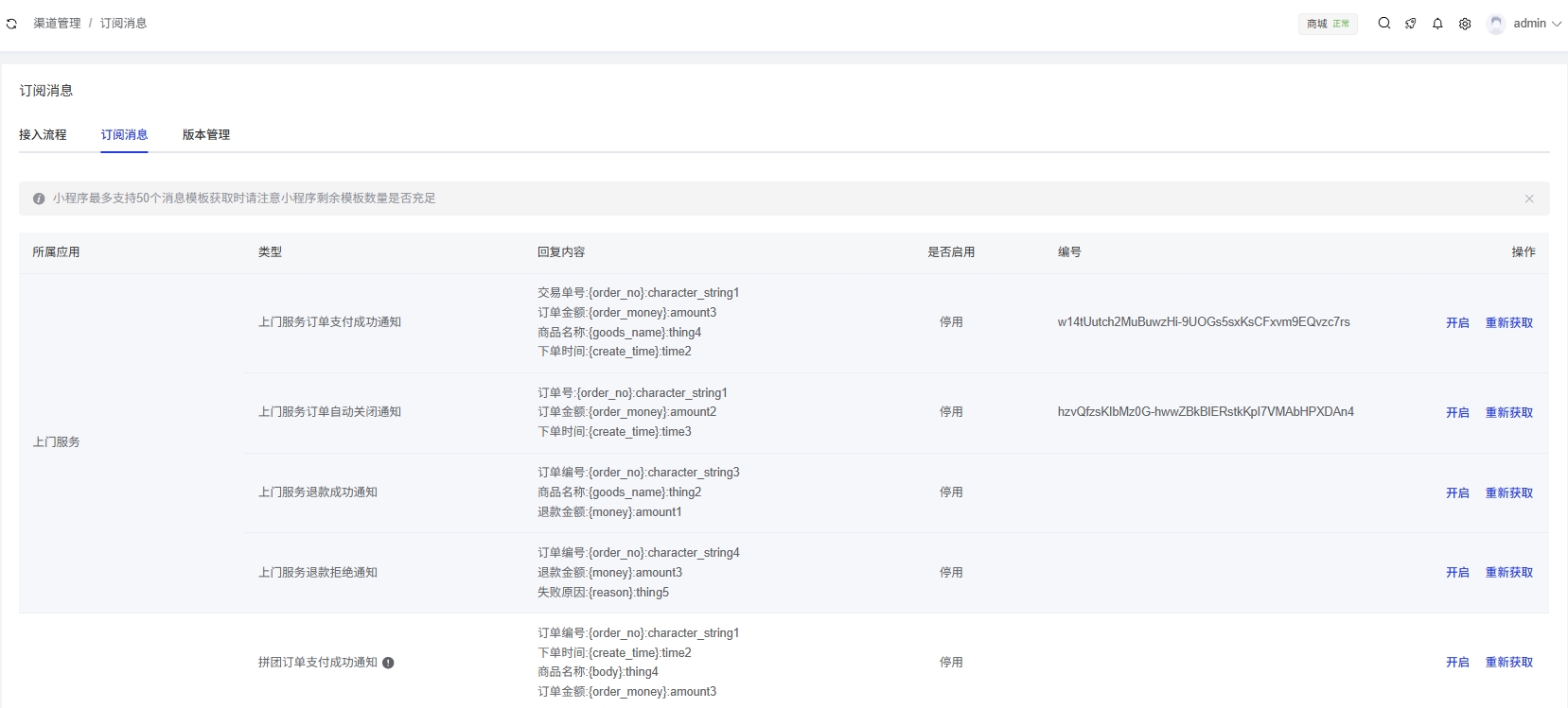显示已申请的各类订阅消息模板,包括订单支付成功通知、上门服务订单状态通知、退款通知等。