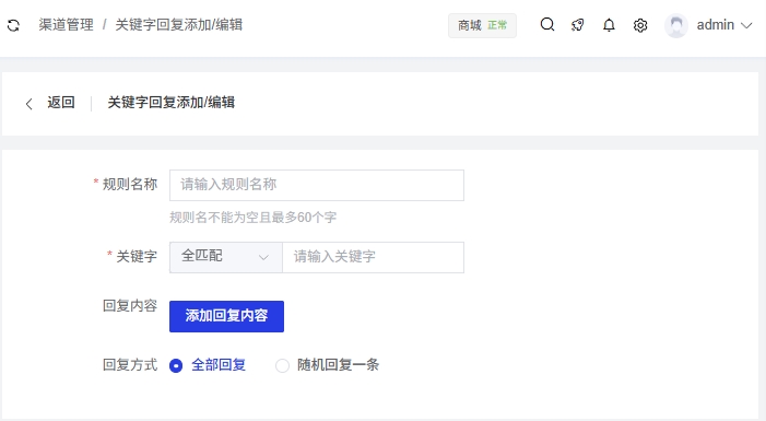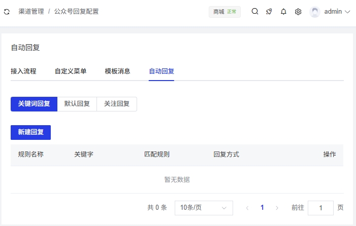 显示已设置的自动回复规则,包括规则名称、关键词、回复内容等。