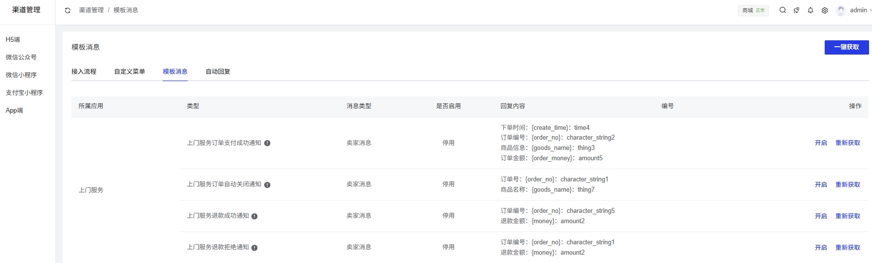 显示各类业务场景的模板消息,如"上门预约订单支付成功通知"、"上门服务预约成功通知"等。