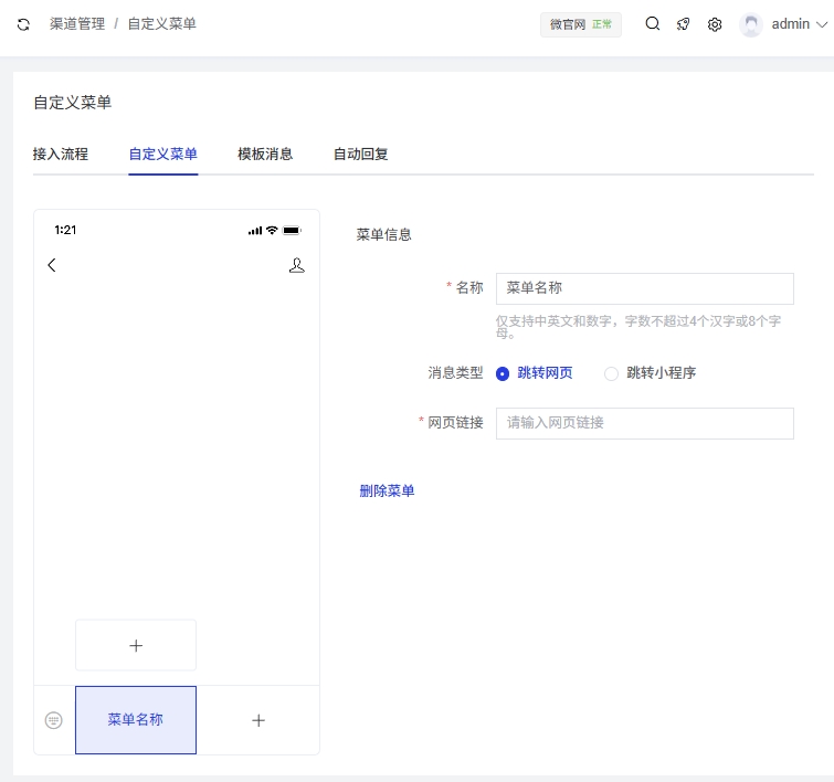 菜单名称:设置菜单的显示名称(支持中文和英文,最多5个汉字)。