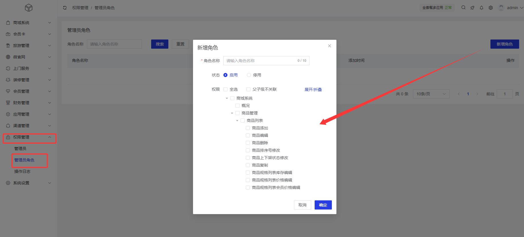 站点端,在权限管理—>管理员角色中控制菜单权限