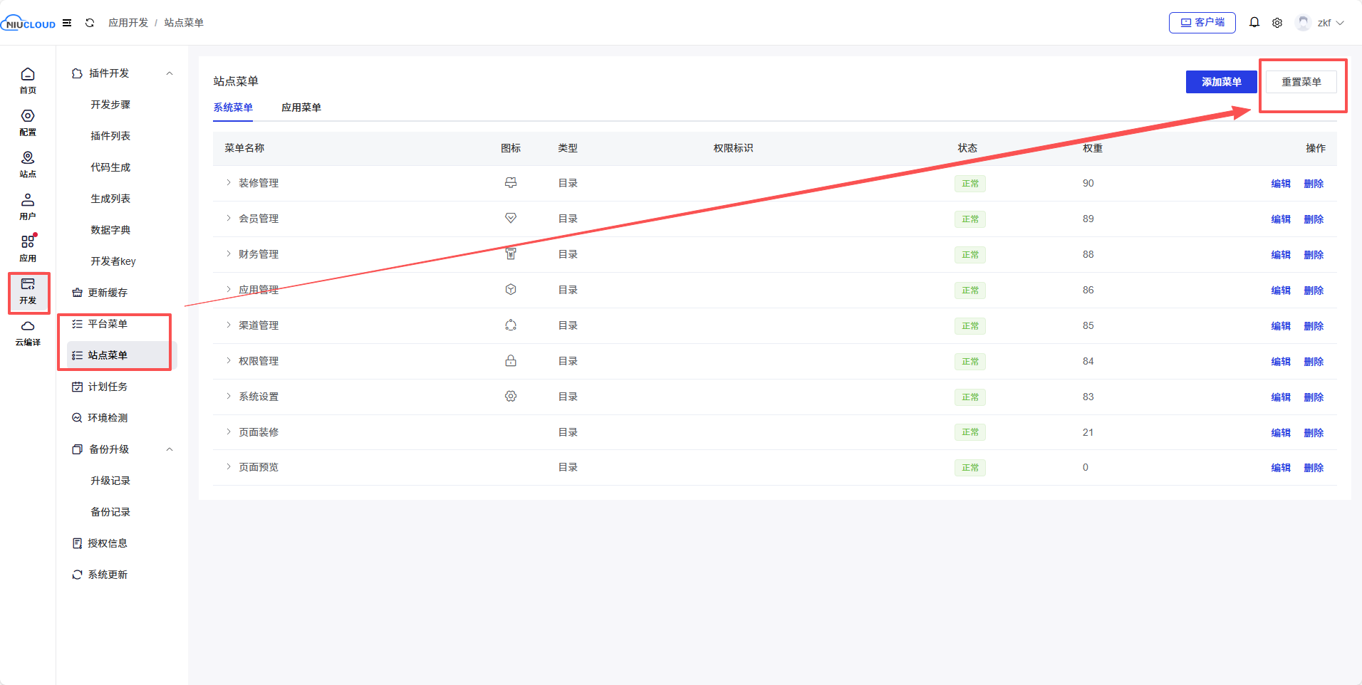 2.点击【开发】->【平台菜单或站点菜单】->【重置菜单】