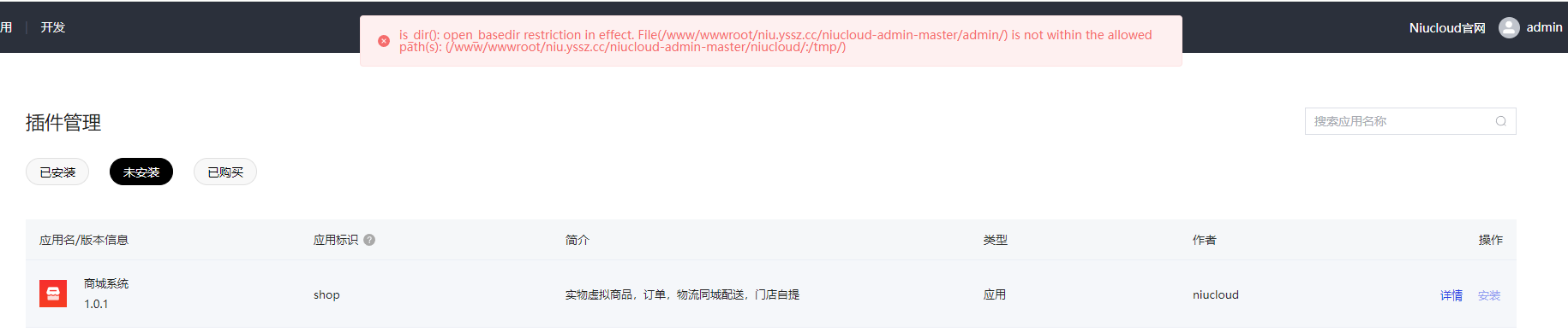 在绑定好授权之后,应用列表点击安装应用时,偶尔会出现 is_dir(): open basedir restriction in effect.File(/wwwl/wwwroot/niu.yssz.cc,/niucloud-admin-master/admin/) is not within the allowedpath(s)😦/www/wwwroot/niu.yssz.cc/niucloud-admin-master/niucloud/:/tmp/) 错误提示