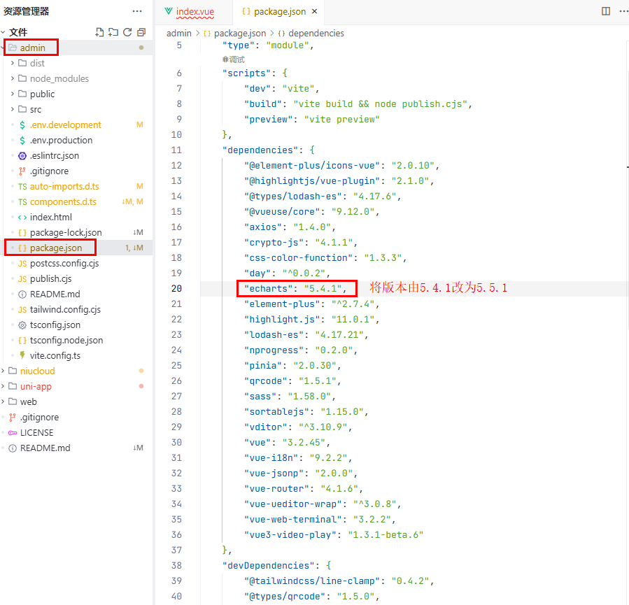 修改 admin 下 package.json 中 echarts 的版本