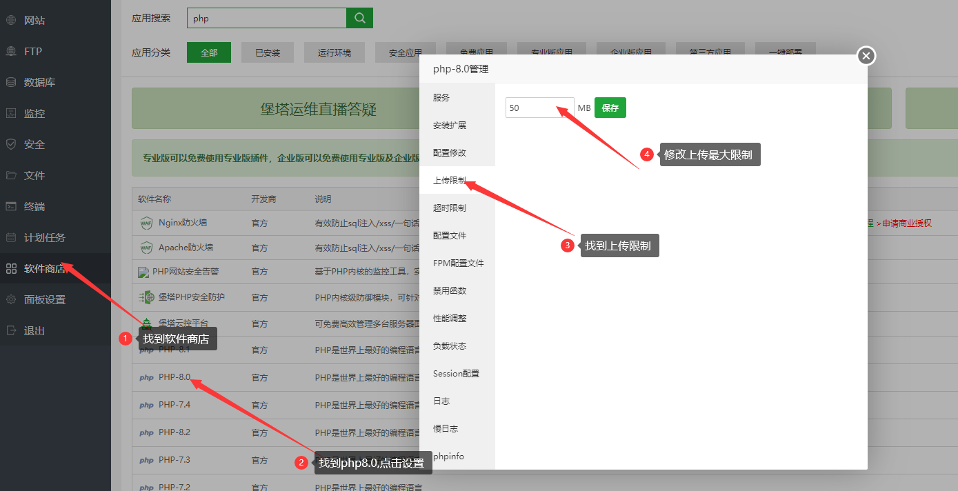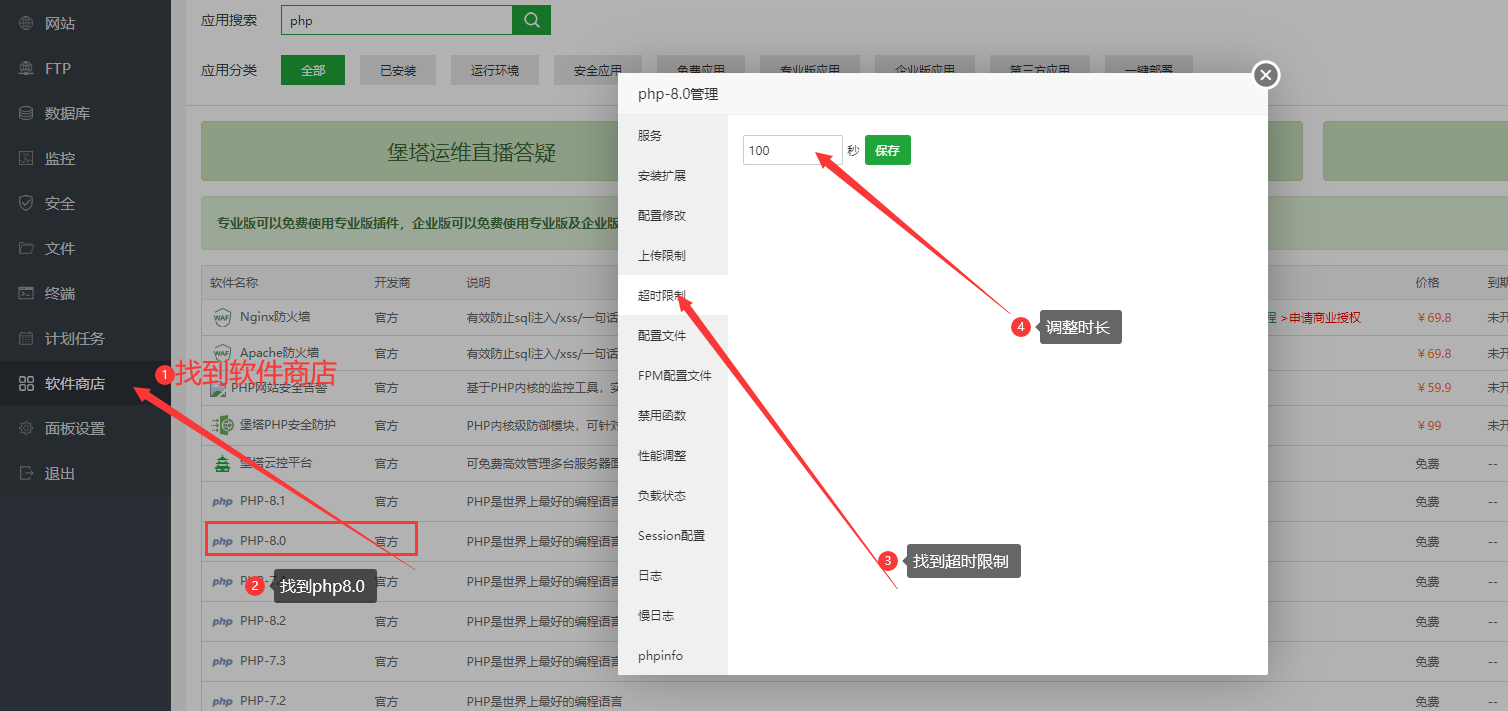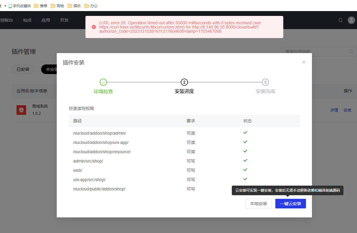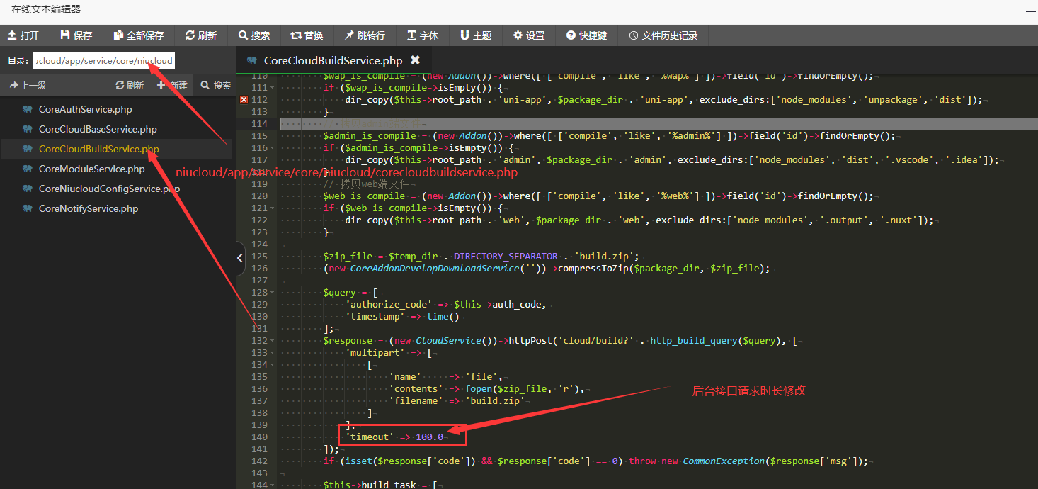 php 的超时限制 nginx 的连接时长限制 php 最大上传限制 文件中代码限制(文件位置:niucloud/app/service/core/niucloud/CoreCloudBuildService.php) 上图4个位置适当调整连接时间限制后,就可以解除上述超时报错问题