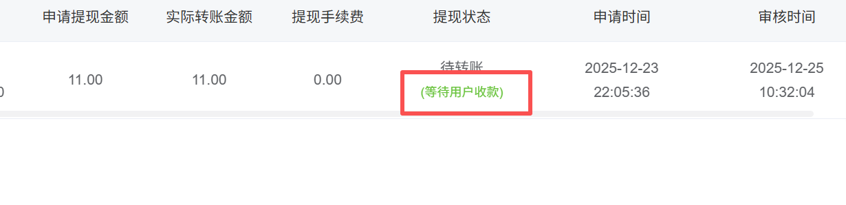 后台财务管理 -> 会员提现 提现状态是待转账(等待用户收款)