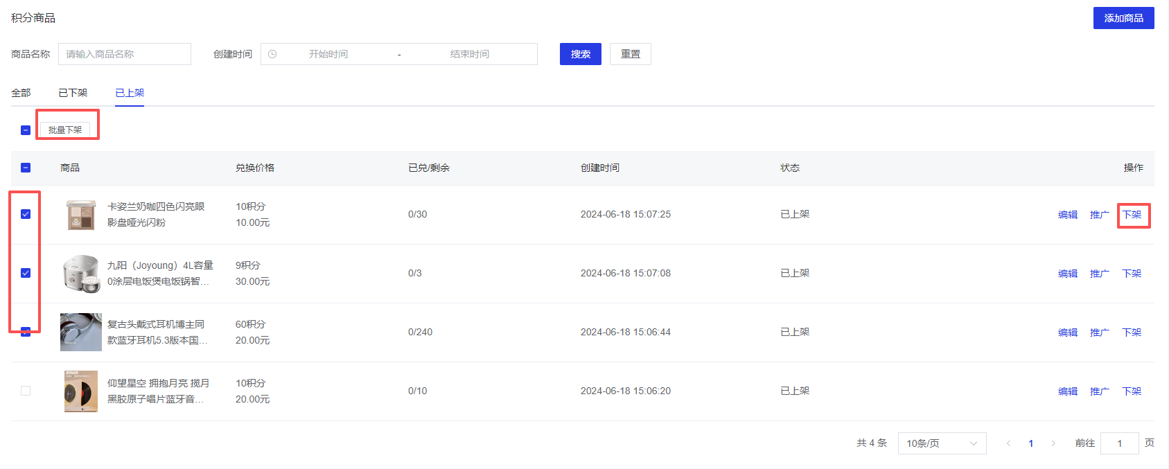 勾选多个商品,点击【批量删除】/【批量上架】/【批量下架】按钮,即可批量删除/上架/下架选中的商品。