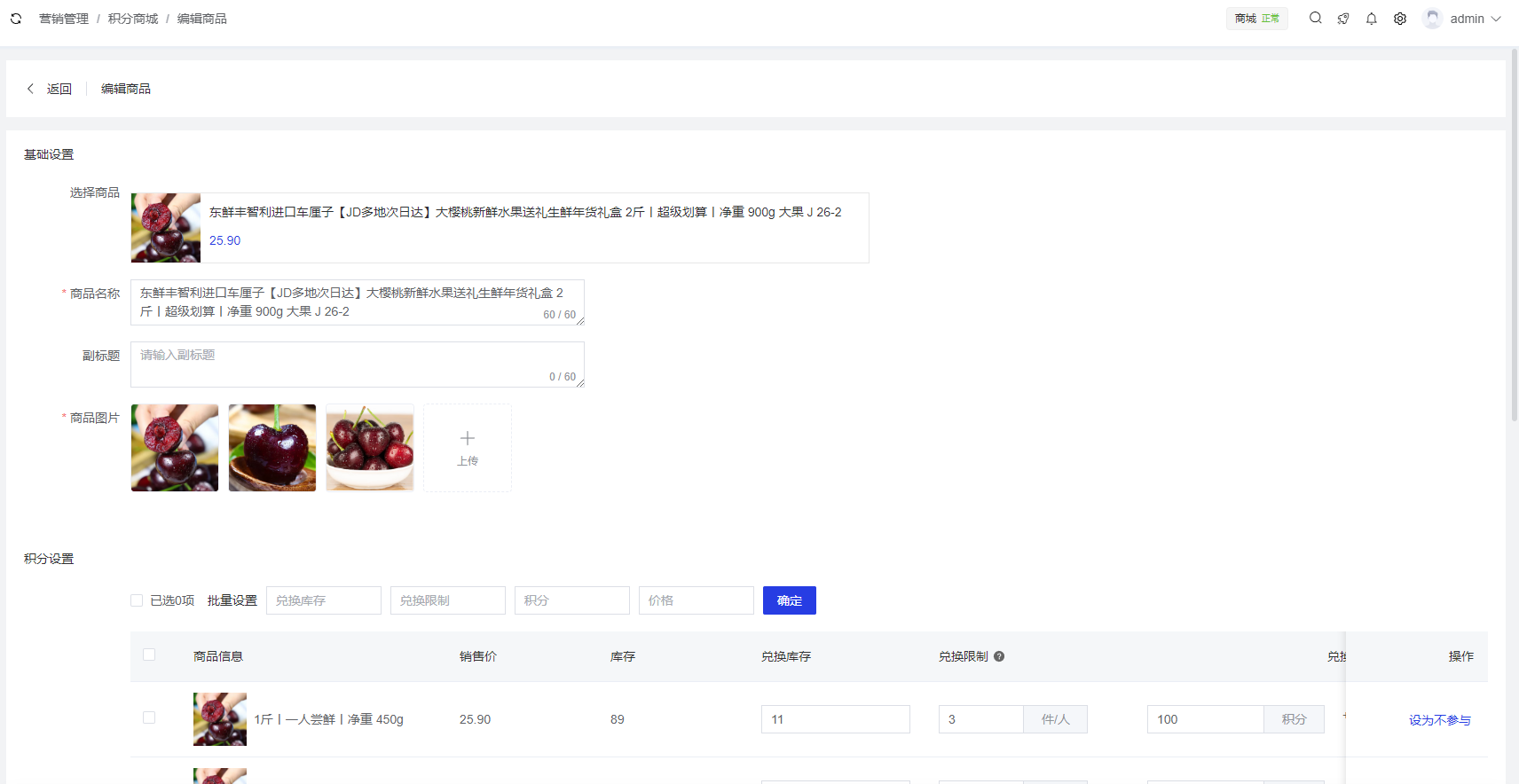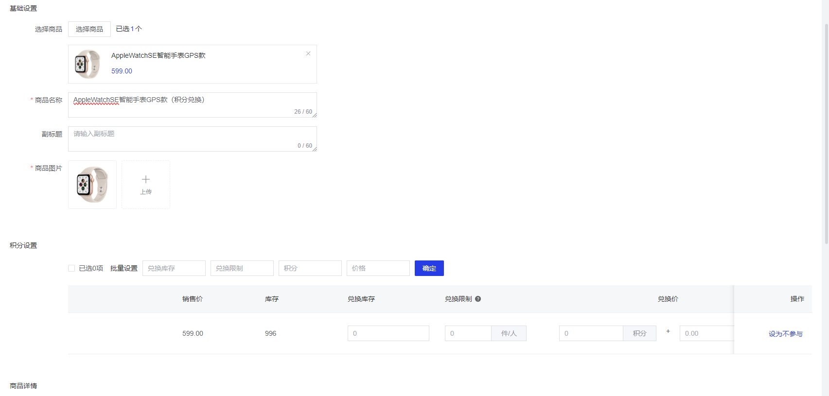 - 选择参与积分兑换活动的商品,商品名称、商品图片、商品详情自动写入(支持编辑)