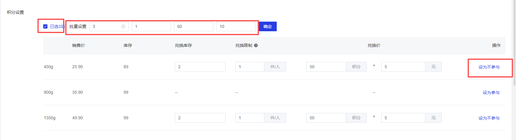 - 多规格商品可删除不参与兑换活动的规格