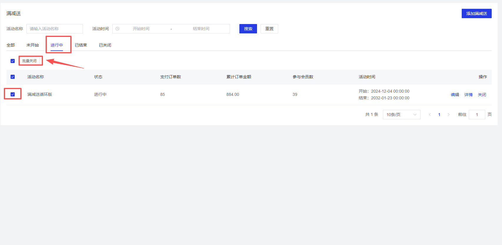 - 批量关闭:选中多个满减送活动,点击【批量关闭】按钮,批量关闭选中的满减送活动