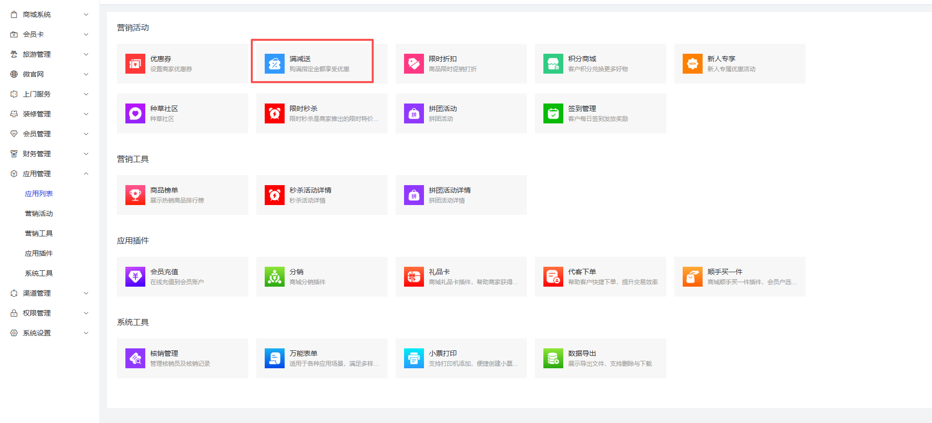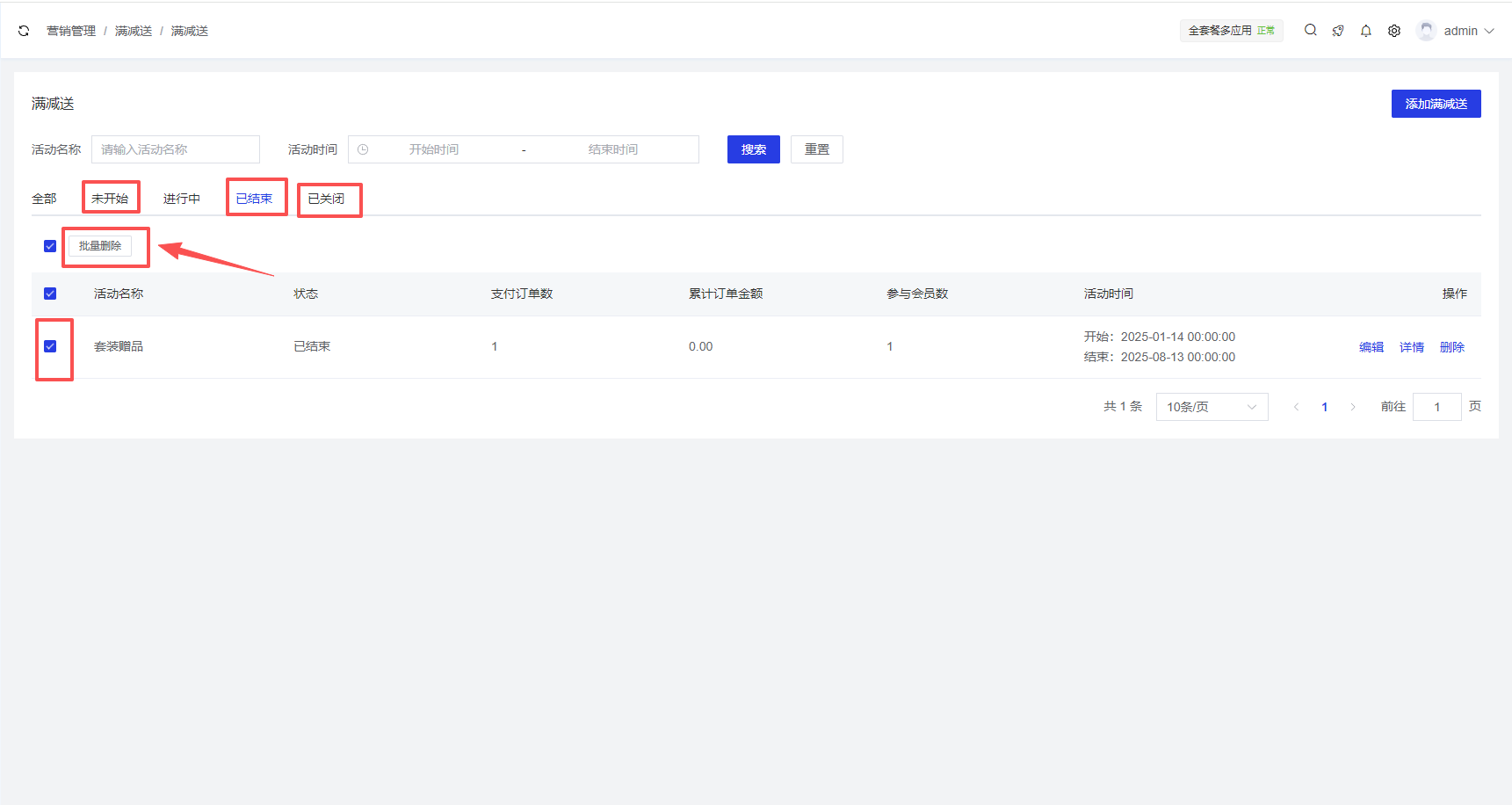 - 批量删除:选中多个满减送活动,点击【批量删除】按钮,批量删除选中的满减送活动