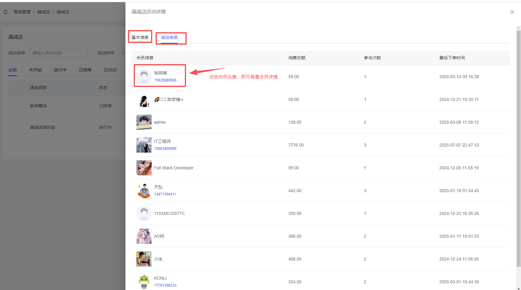 点击【查看】按钮,即可查看活动的详细信息,包括活动基本信息以及参与活动会员信息(点击会员头像即可查看该会员详情)。