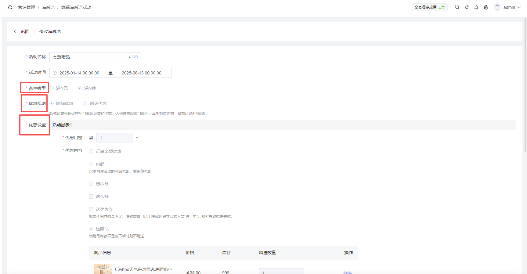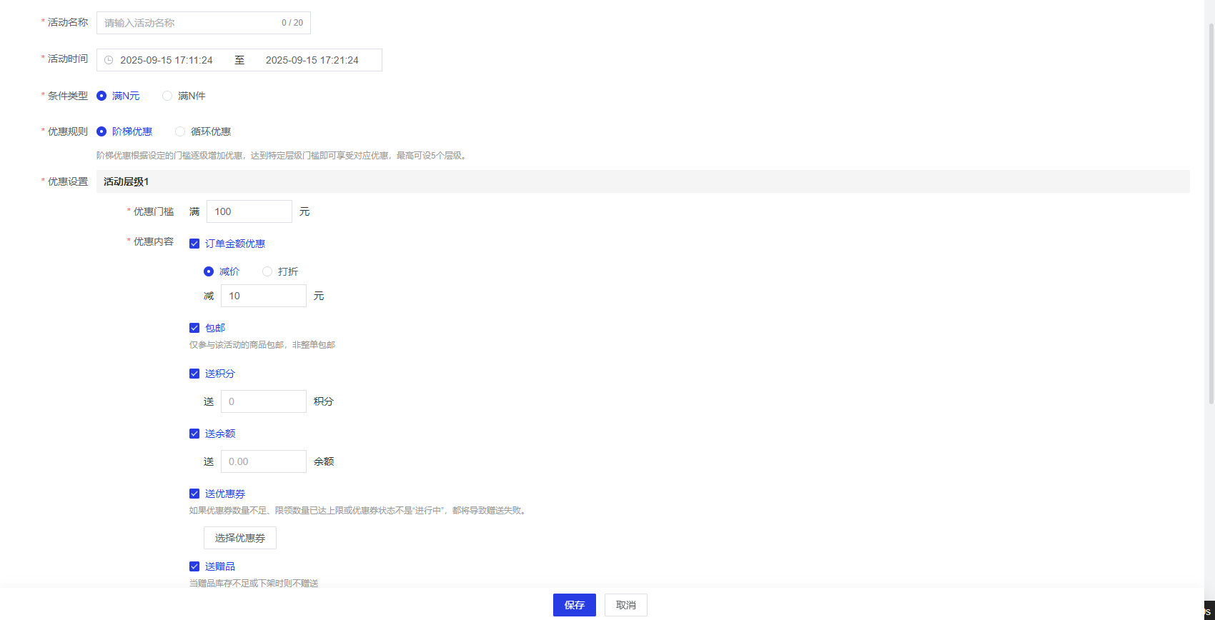 - 送赠品:可自定义选择赠品、赠品数量(当赠品库存不足或下架时则不赠送)