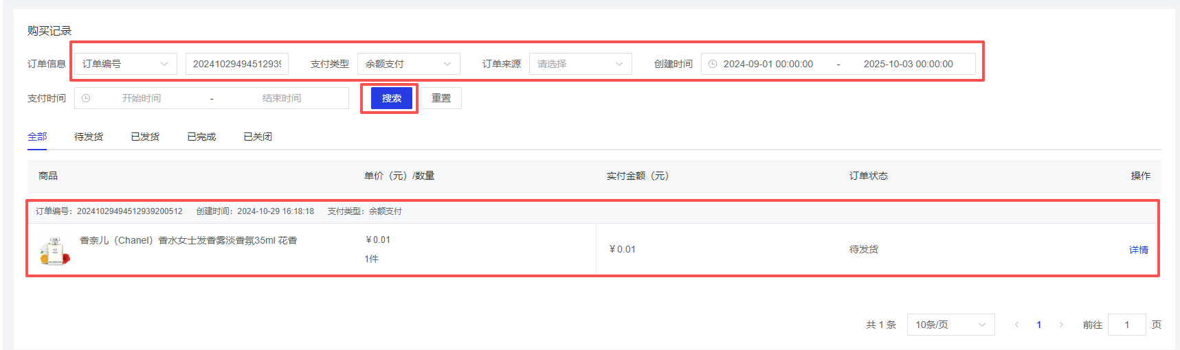 提供多维度搜索筛选条件,方便快速定位特定订单(支持选择订单信息、支付类型、订单来源、创建时间、支付时间等字段)