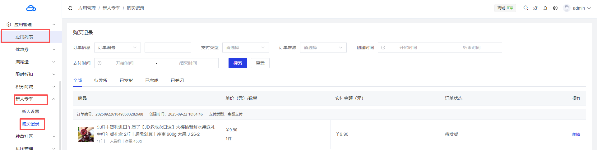 应用管理 > 应用列表 > 新人专享 > 购买记录