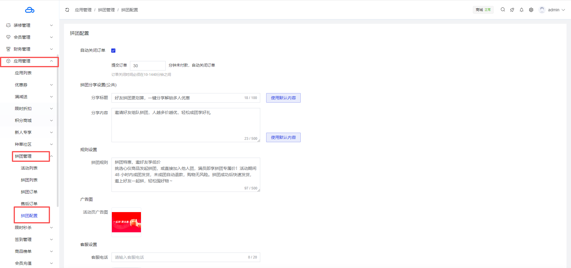 应用管理 > 应用列表 > 拼团管理 > 拼团配置