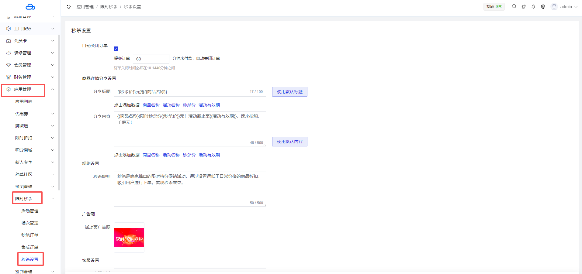 应用管理 > 应用列表 > 限时秒杀 > 秒杀设置