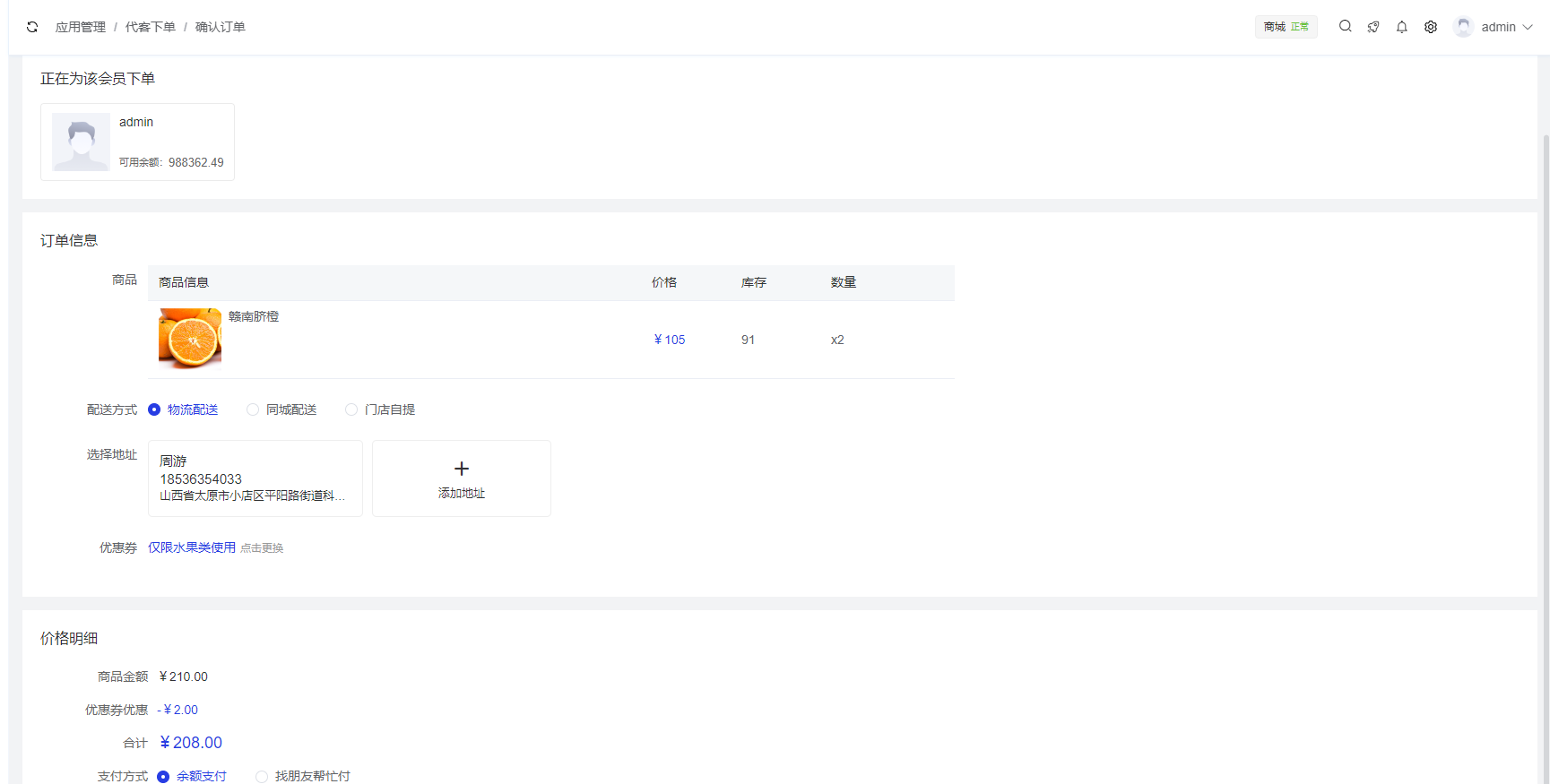 3、点击结算按钮,确认配送方式、配送地址、支付方式(支持余额支付、找朋友帮忙付)