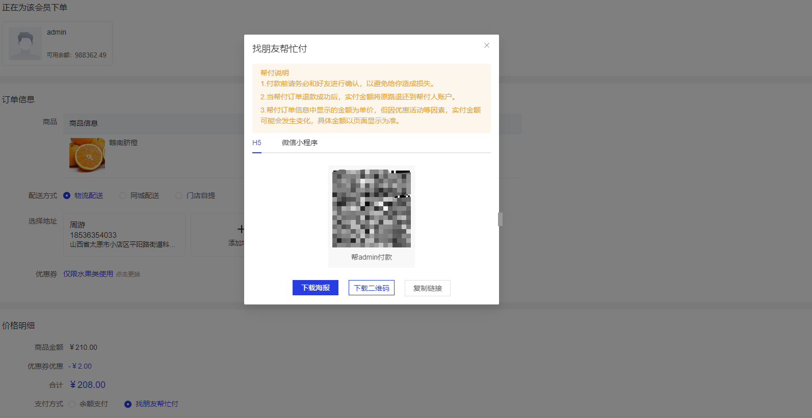- 4.可以通过H5/微信小程序进行帮付操作。(支持下载海报/下载二维码/复制链接)