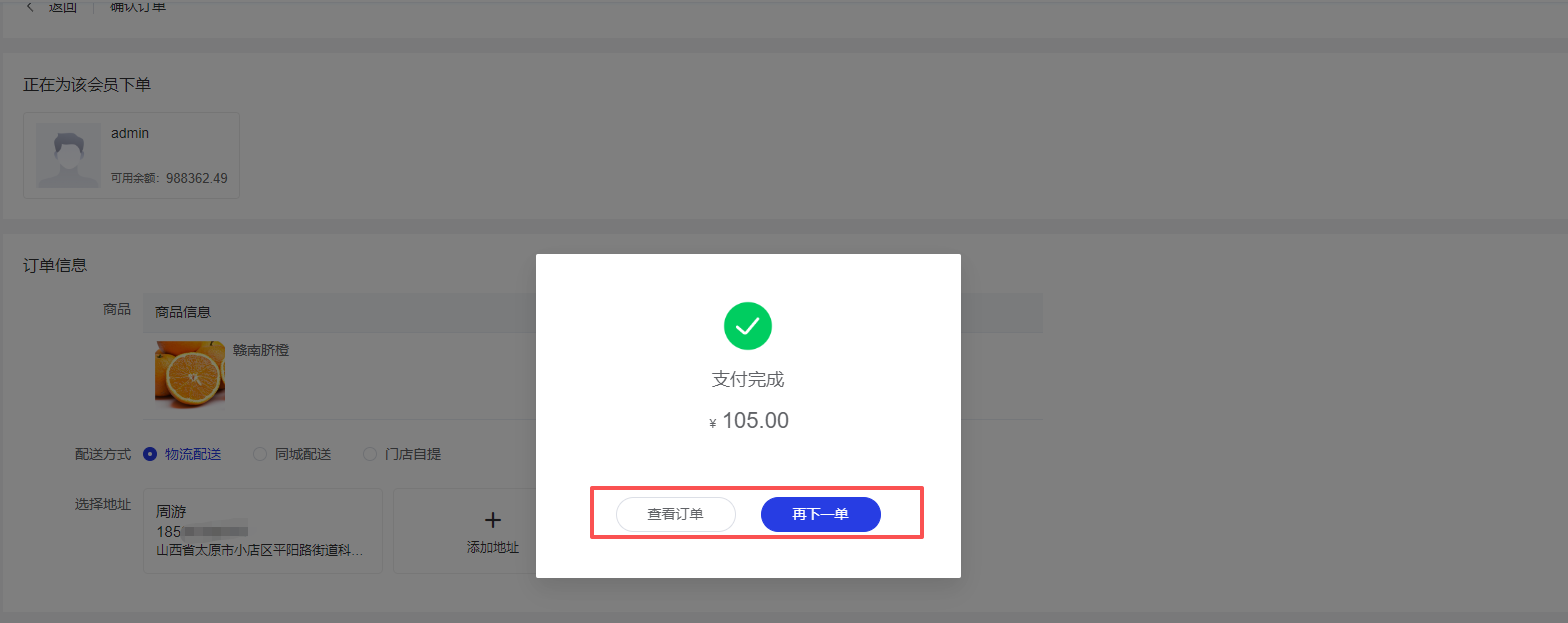 4、点击提交订单按钮,支付完成后可以选择再下一单或直接查看订单