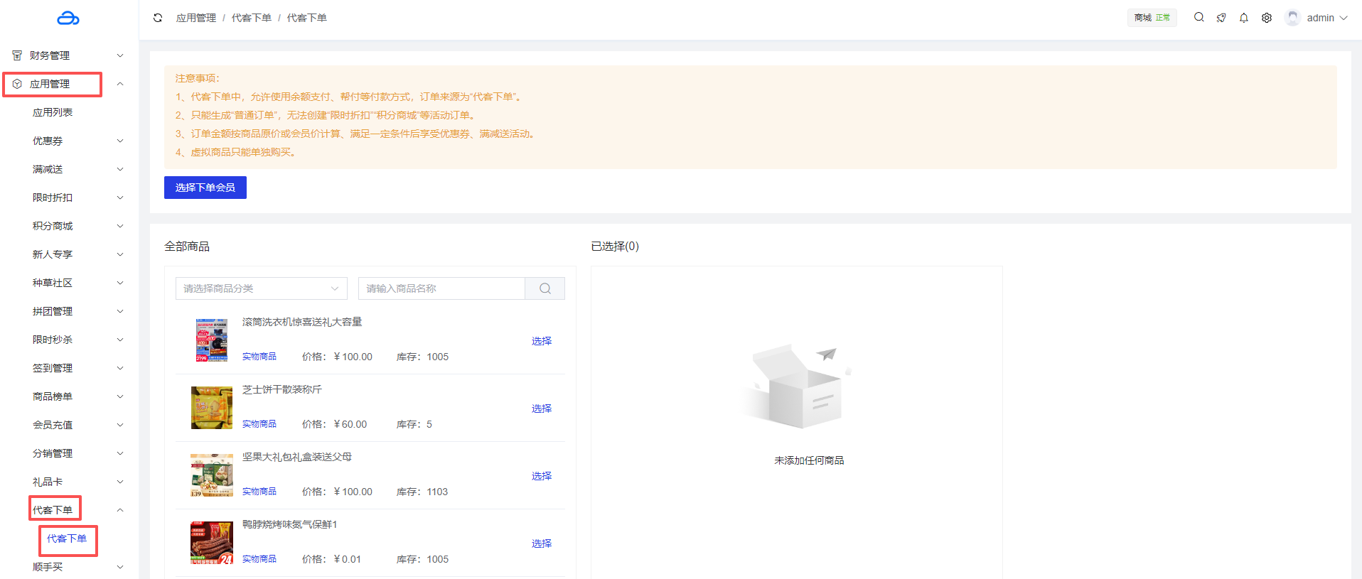 代客下单功能允许商家帮助会员进行购物下单操作,商家可以直接在后台为会员选择商品、确定数量并完成订单创建,无需会员主动操作。