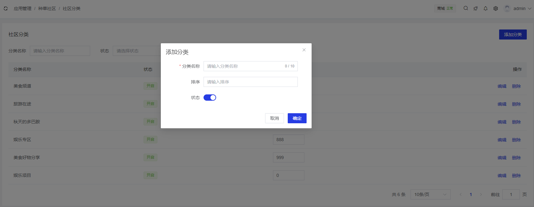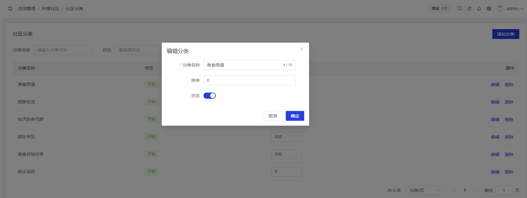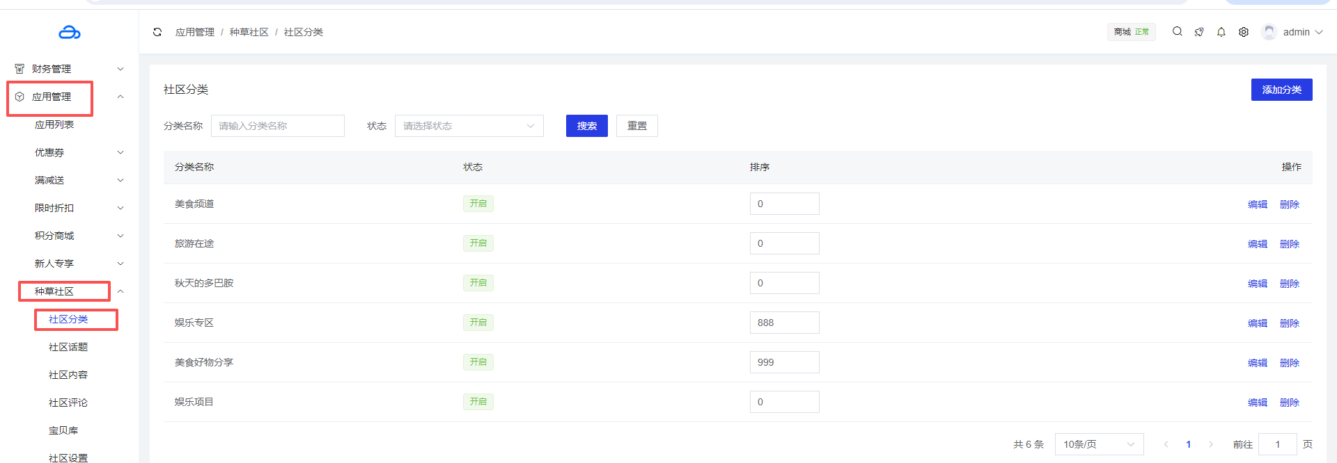 社区分类用于对社区内容进行分类管理,方便用户快速查找感兴趣的内容,支持商家自定义分类名称、设置分类状态和排序。