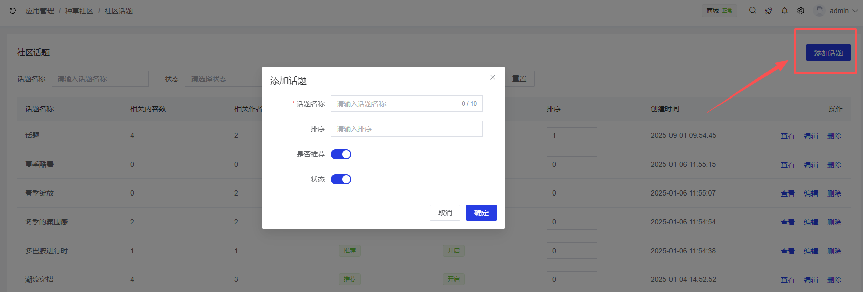 点击【添加话题】,填写话题名称、排序,设置是否推荐和状态,点击【确定】添加话题。