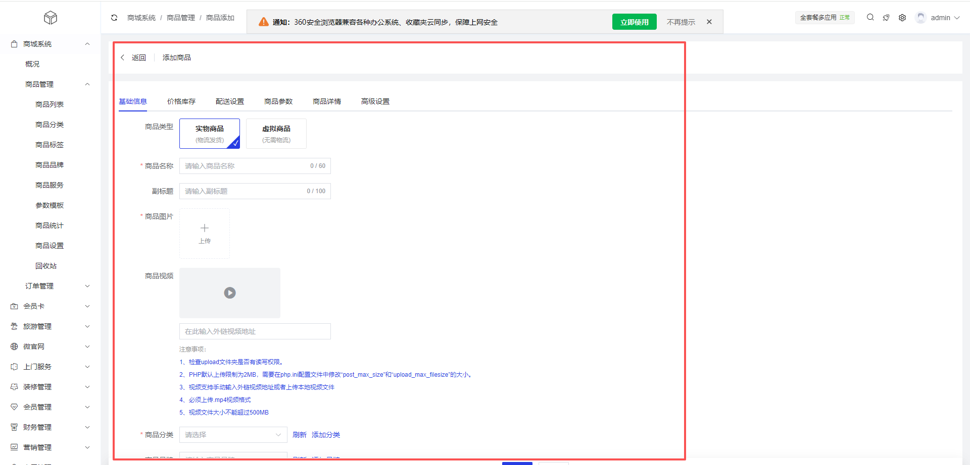 添加商品可分为基础信息、价格库存、配送设置、商品参数、商品详情和高级设置。每个模块对应设置商品不同的信息。以下将按添加流程顺序对各模块功能进行详细说明。