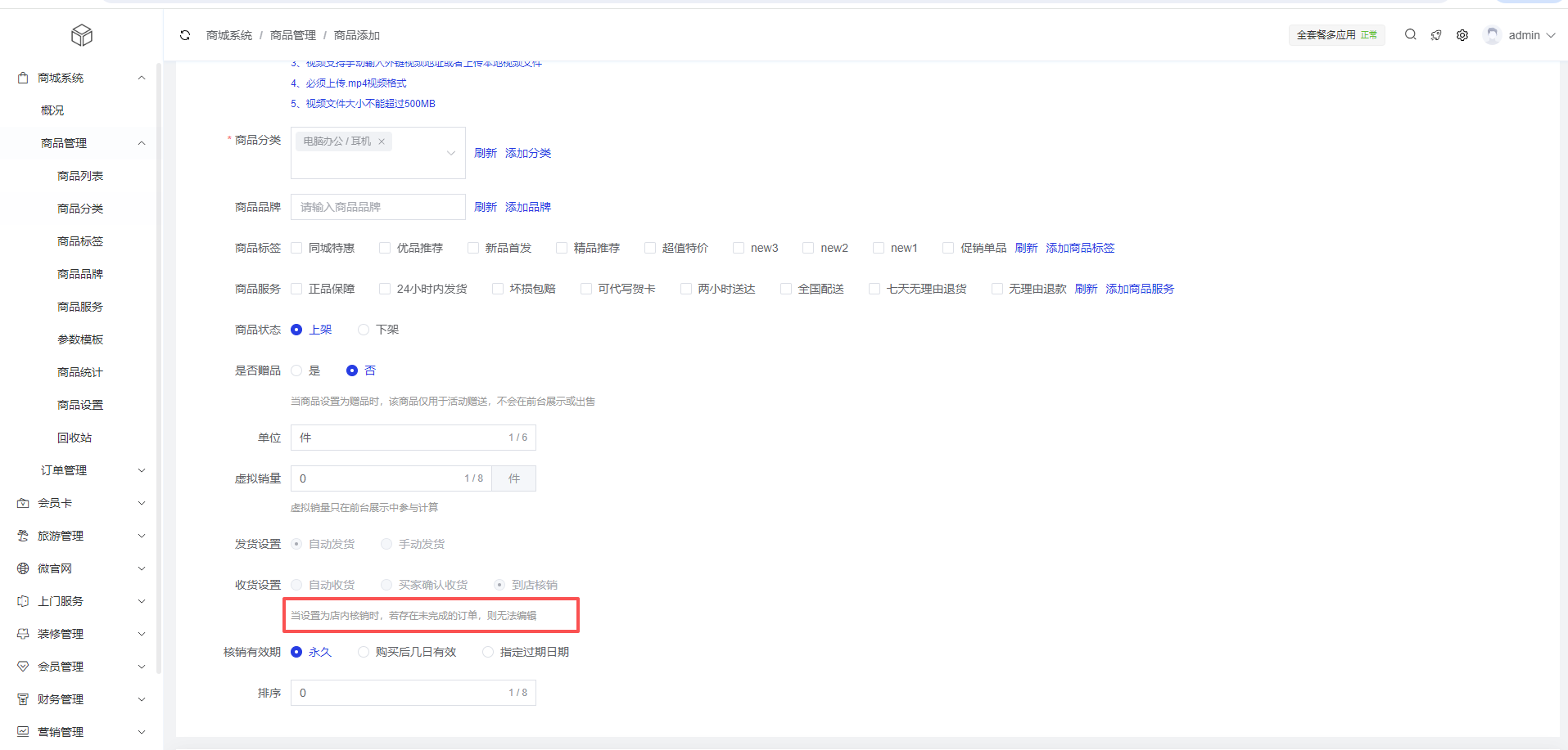 - 针对虚拟商品:当【收货设置】为到店核销时,若存在未完成的订单,则无法进行编辑【发货设置】、【收货设置】。