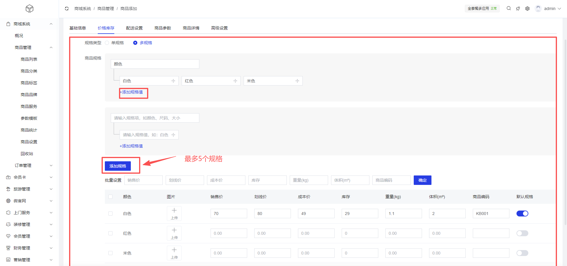 - 单规格/多规格:必选项,控制商品SKU管理模式。单规格适用于无属性差异商品;多规格支持颜色、尺寸大小等多维度属性组合管理(最多添加5个规格项)