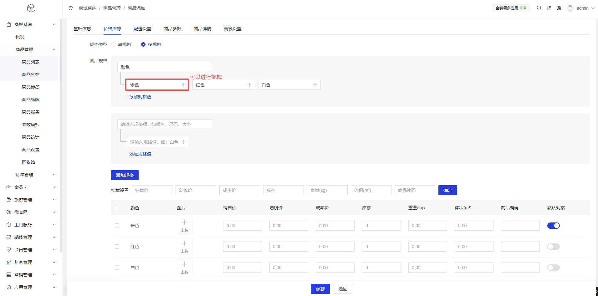- 体积:选填项,商品体积(m³),精确到两位小数,用于仓储空间计算
