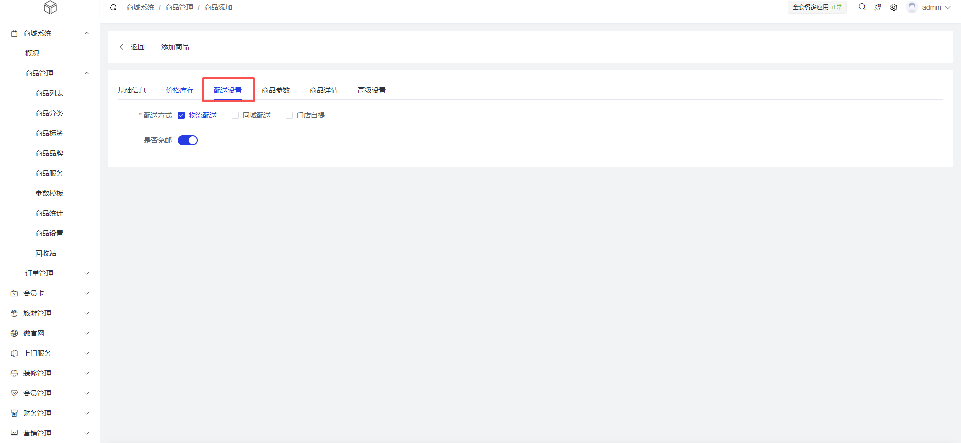 - 配送方式:必选项,支持多选(物流配送/同城配送/门店自提),控制商品的配送渠道