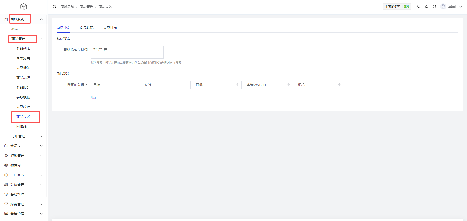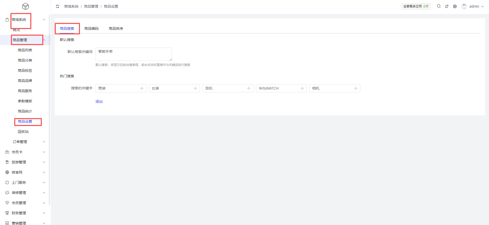 设置商品搜索规则,包括默认搜索关键词和热门搜索词。