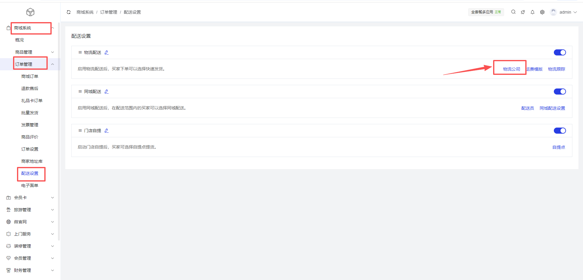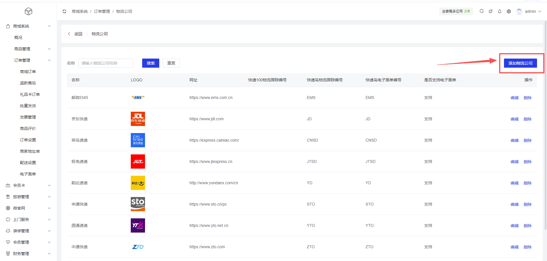商城系统 > 订单管理 > 配送设置> 物流公司