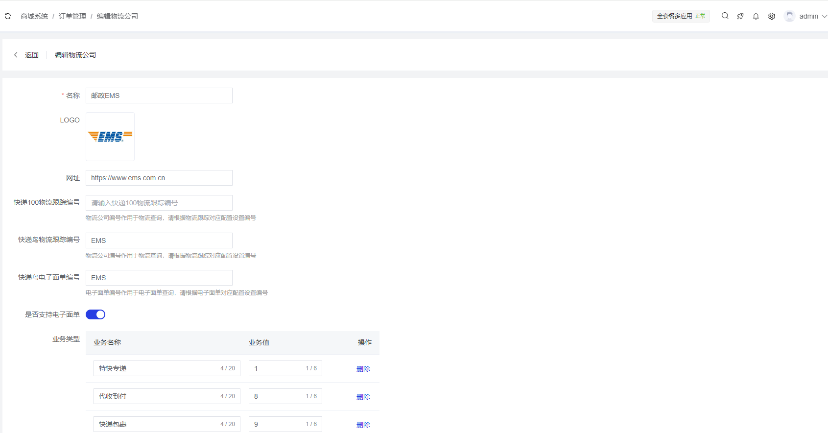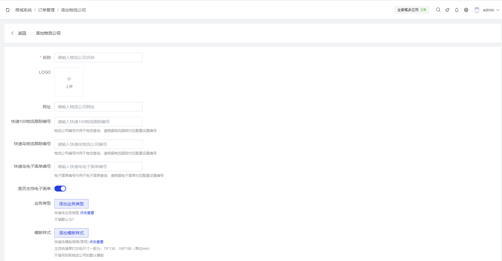 集中管理商城系统中合作的快递公司信息,支持添加、编辑、删除物流公司,并配置物流跟踪和电子面单相关参数。
