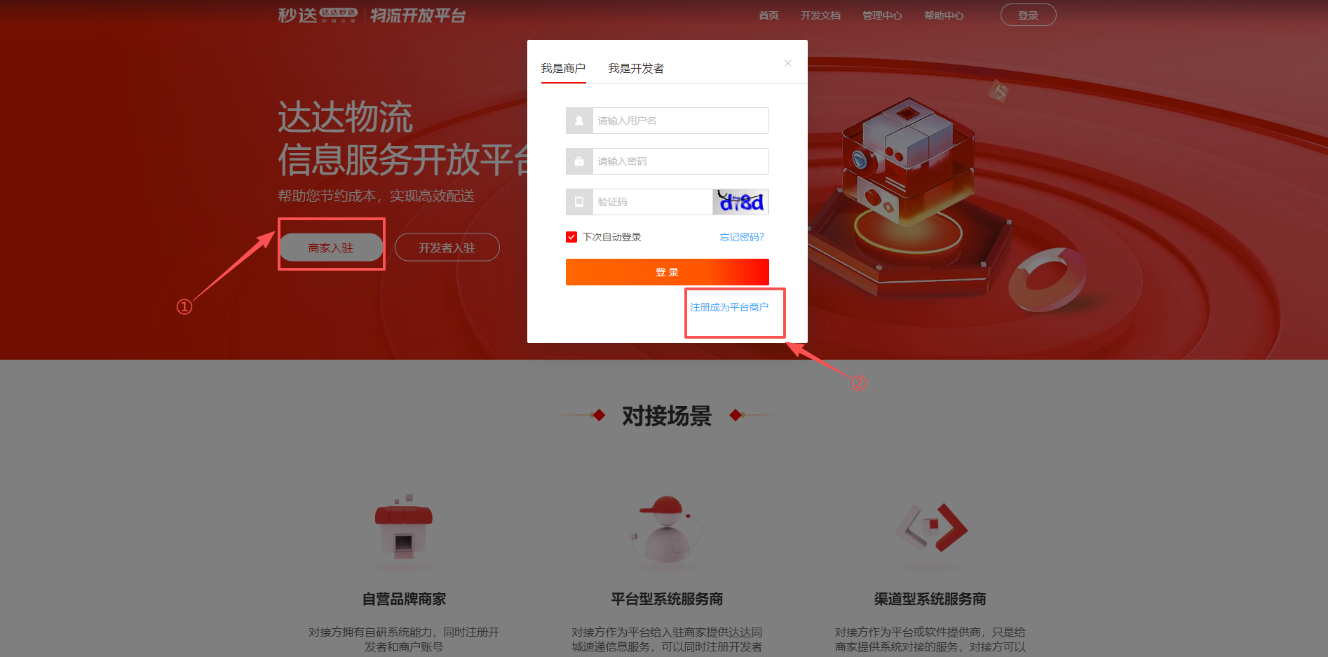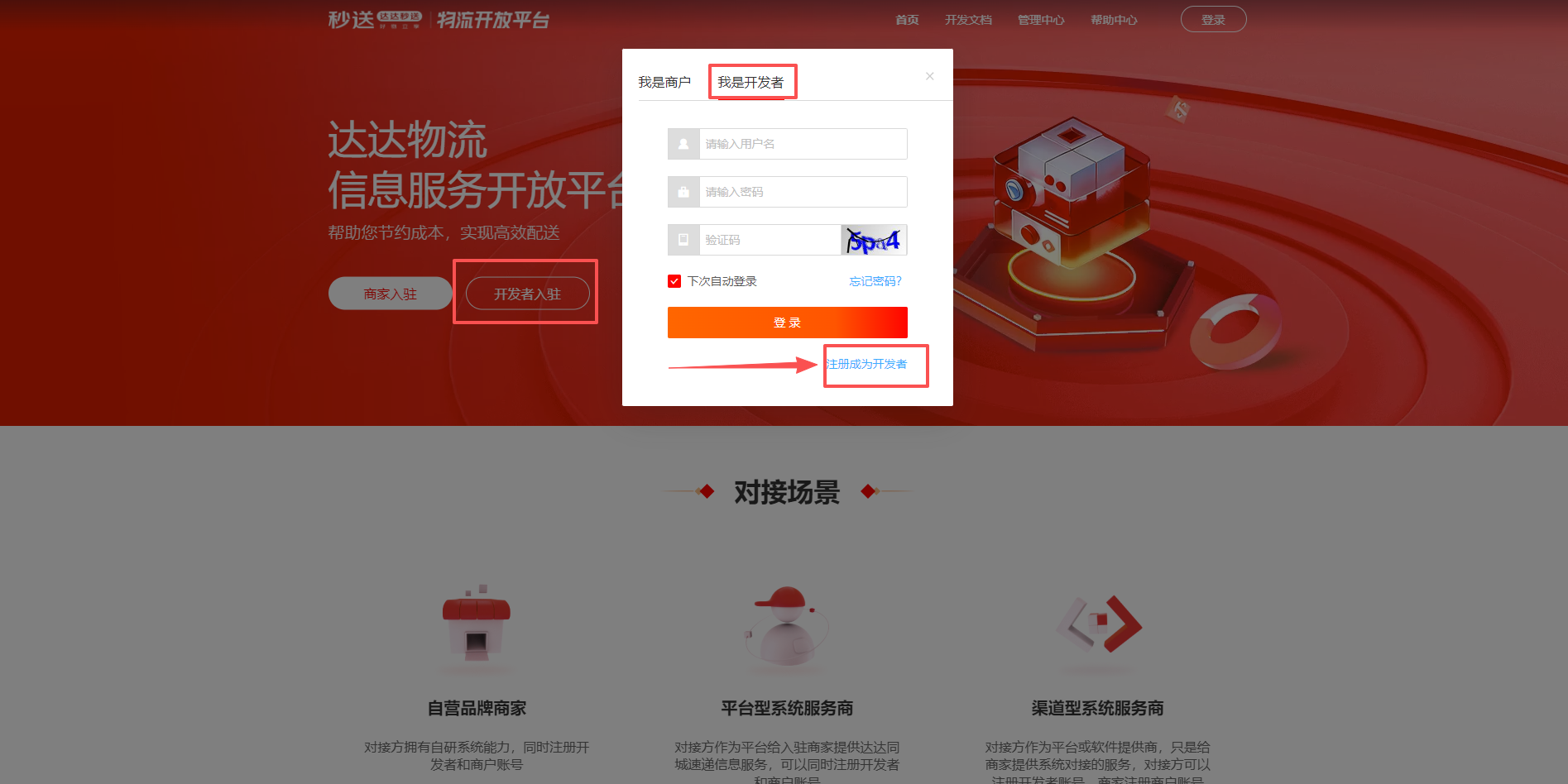 步骤4:退出商户登录,注册为开发者,注册完成后进行登录