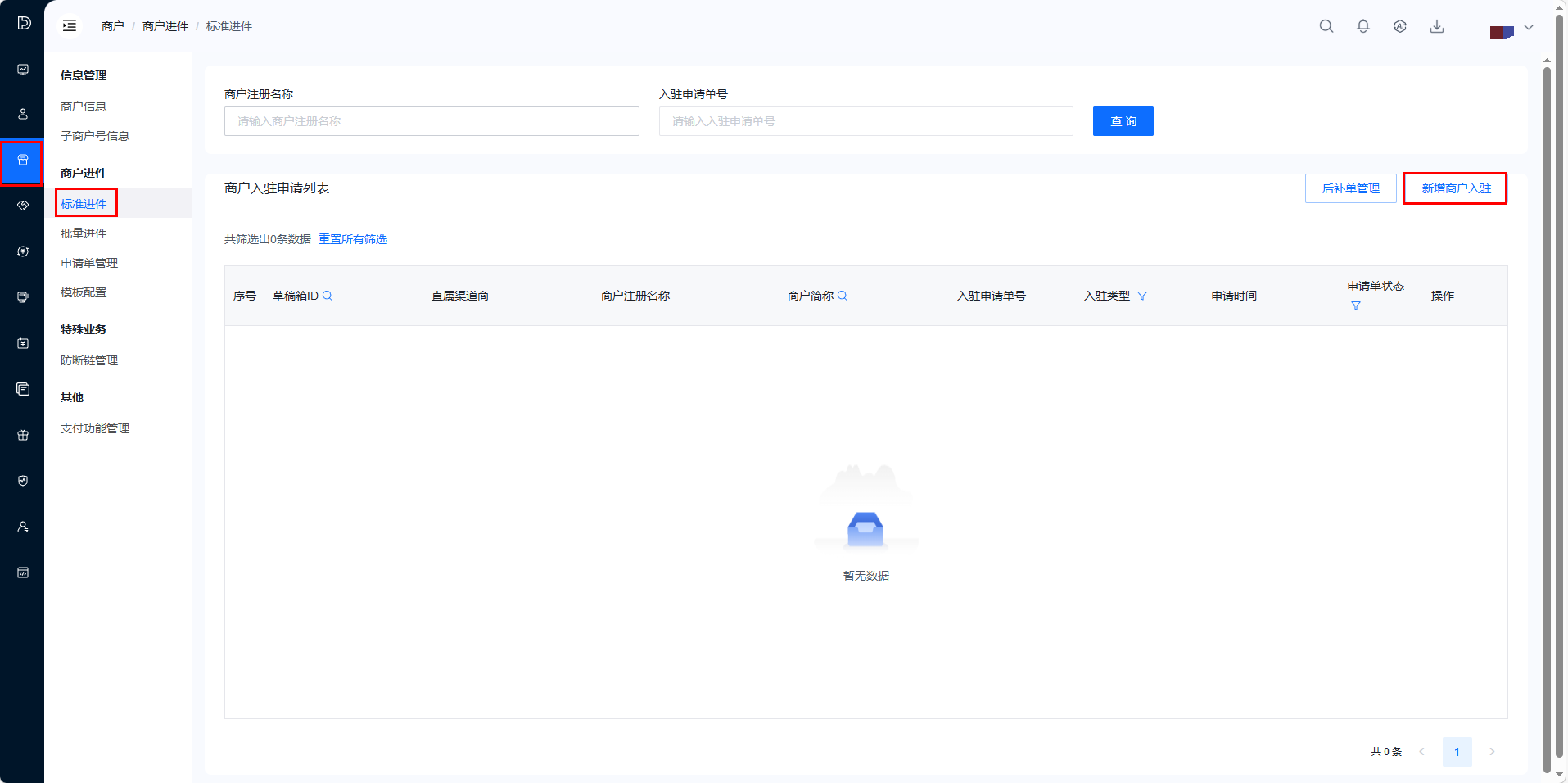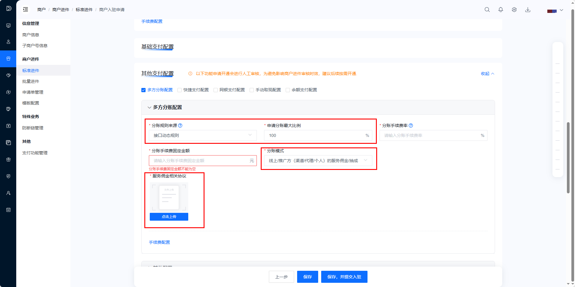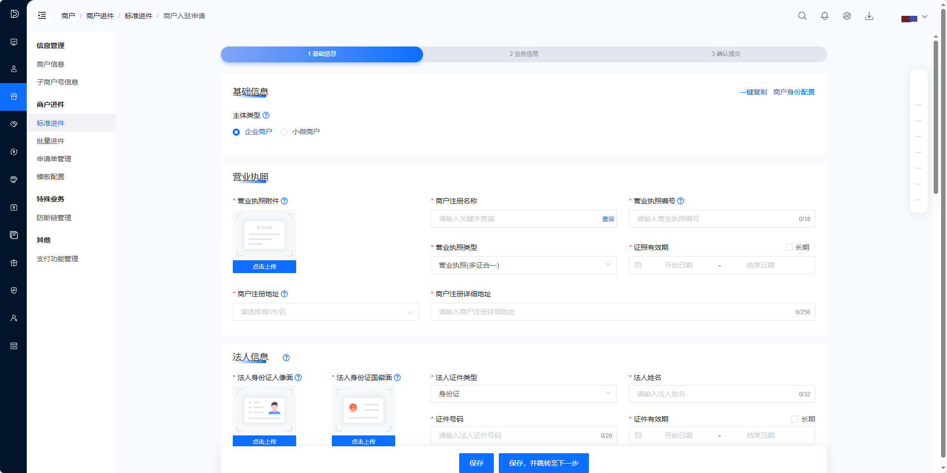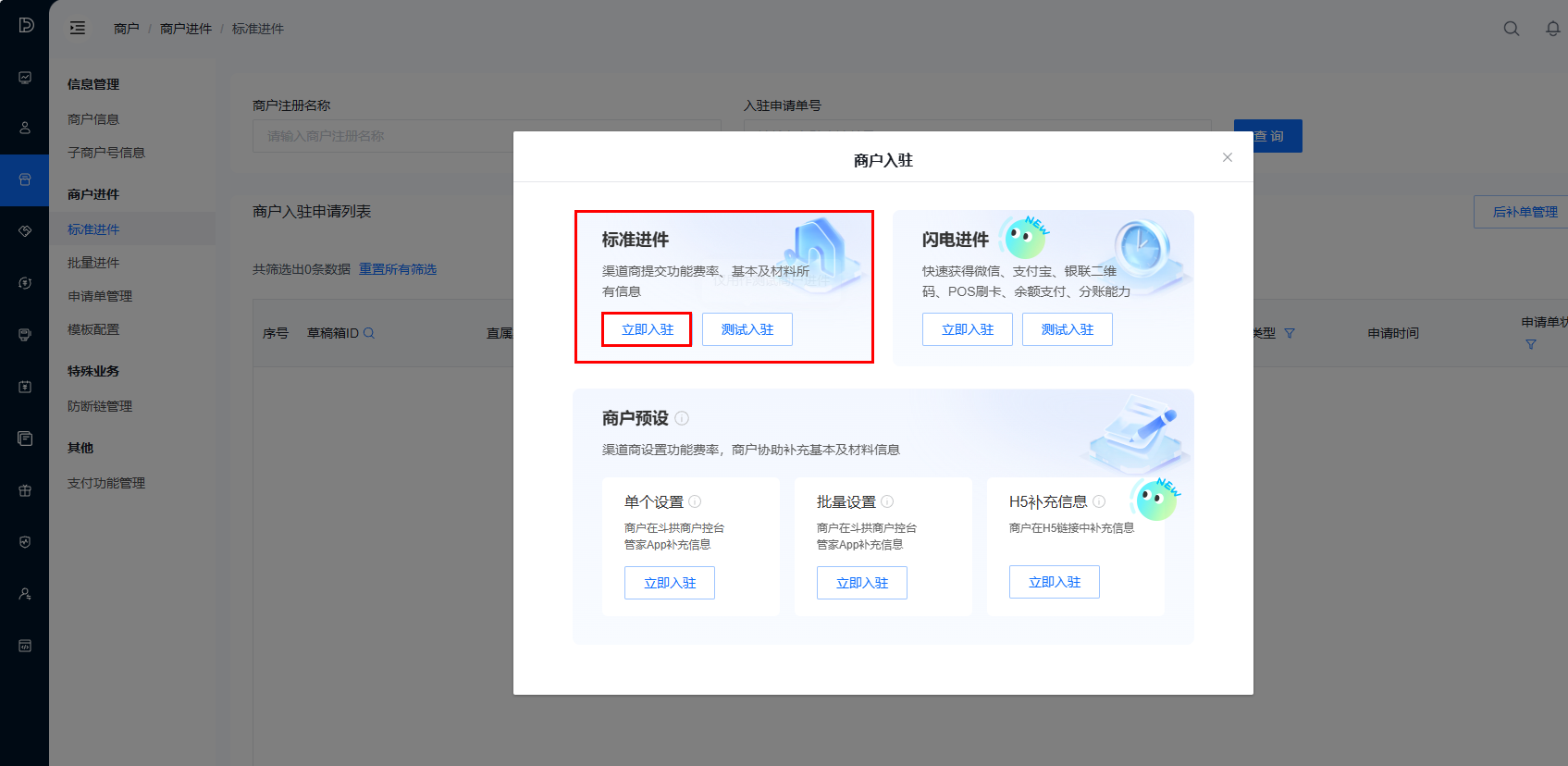 点击「标准进件」-「立即入驻」按钮,进入商户信息填写页面