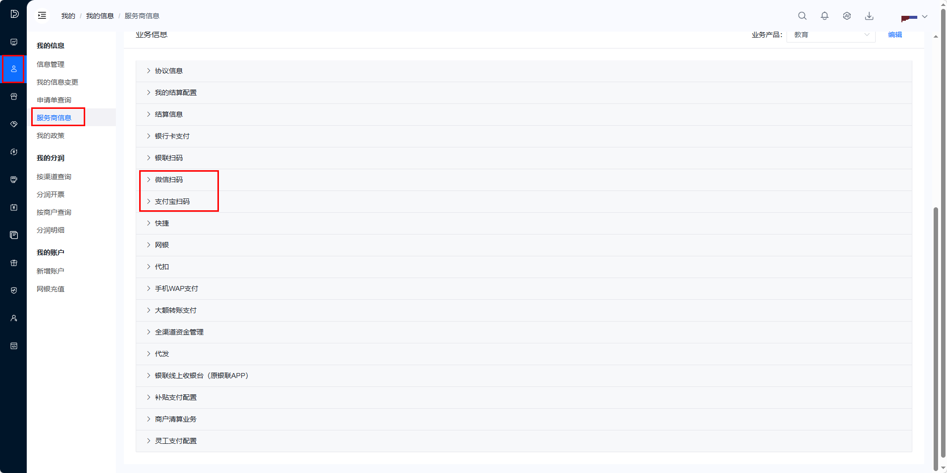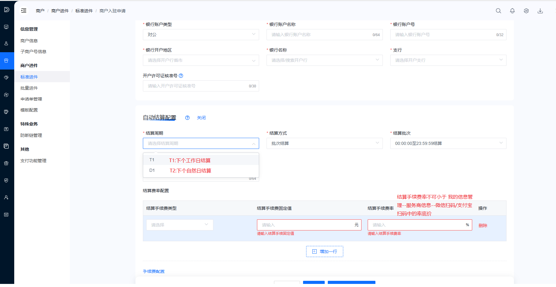 手续费率配置:结算手续费率、节假日结算手续费率,不得低于「我的信息管理」-「服务商信息」-「微信扫码/支付宝扫码」中的率底价,否则将被驳回