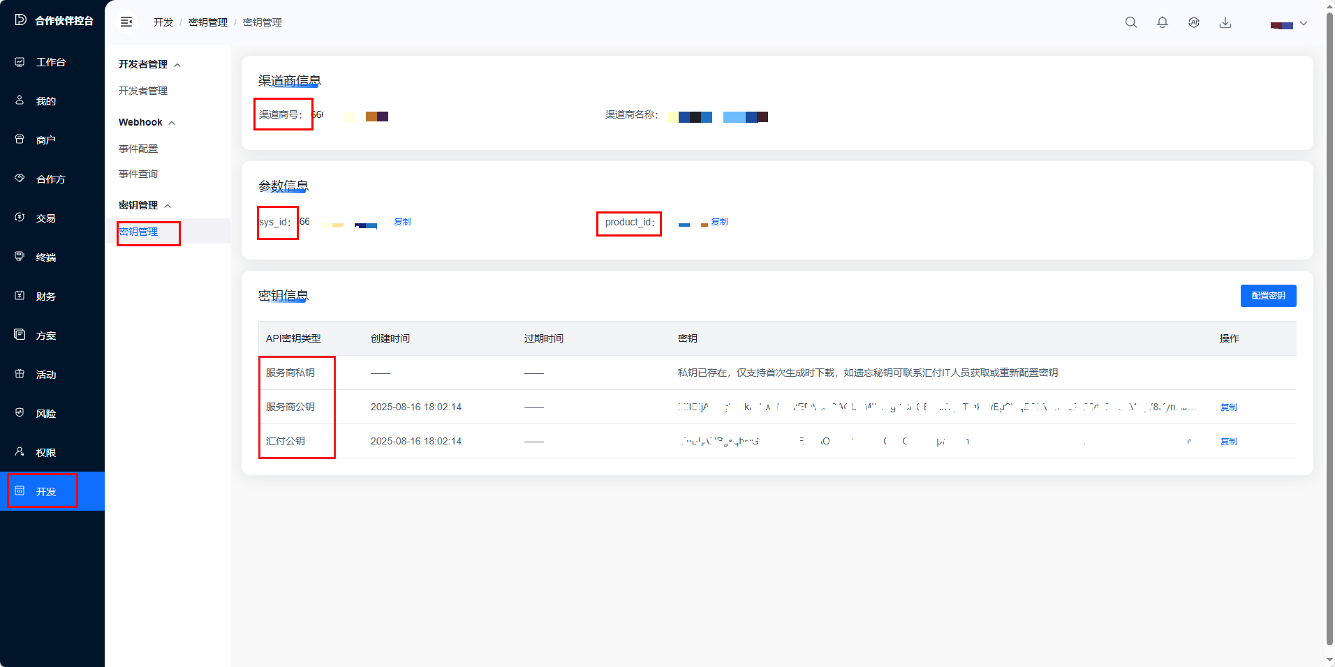 进入汇付后台路径:开发 → 密钥管理,复制页面中的密钥信息,提供给 NIUSHOP 平台后台配置使用;