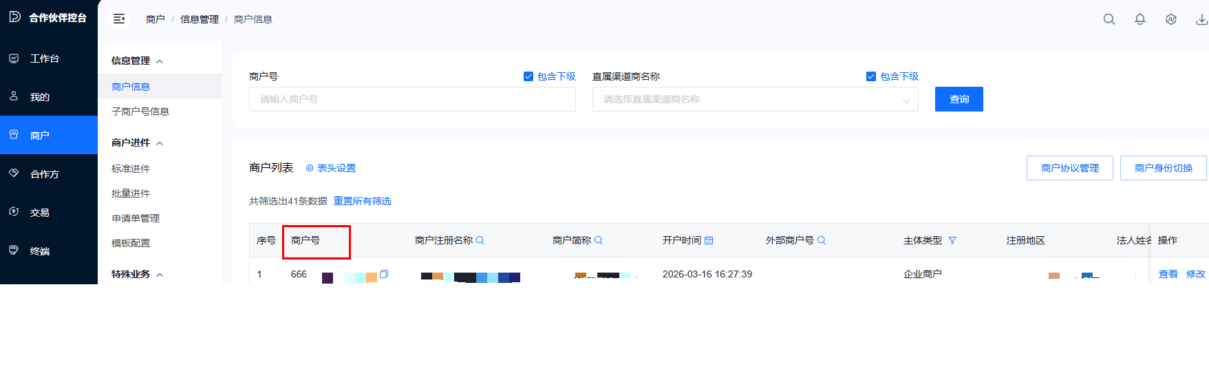 商户信息查看:进入商户 → 商户信息,可查看已入驻商户的审核状态、配置参数、基础信息等;
