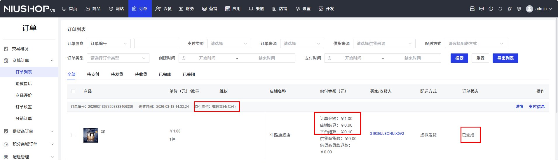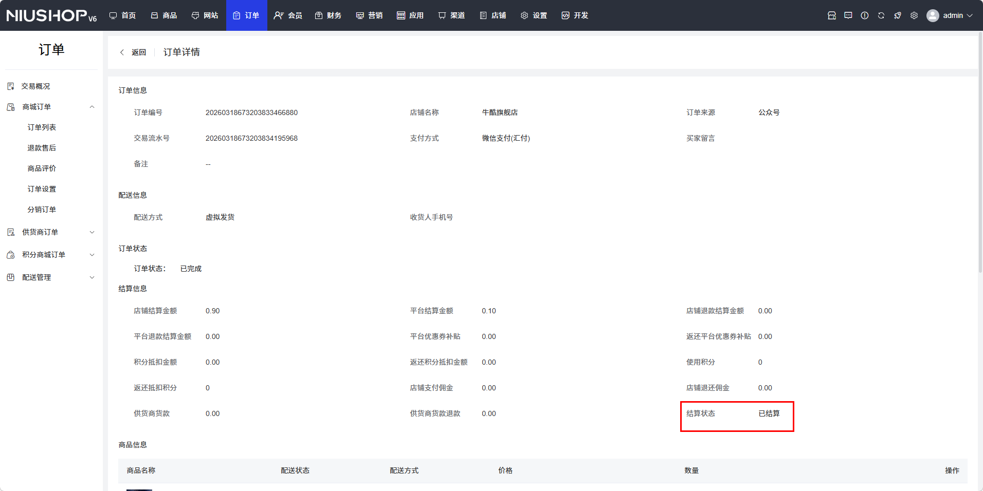 店铺结算金额= 订单金额(1元)- 平台手续费(0.1元)= 0.9元