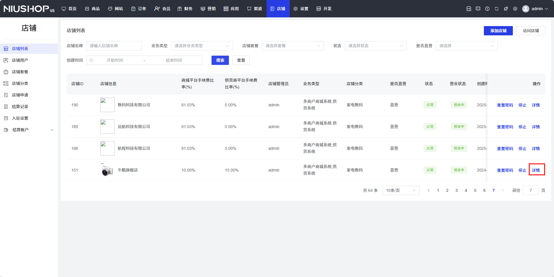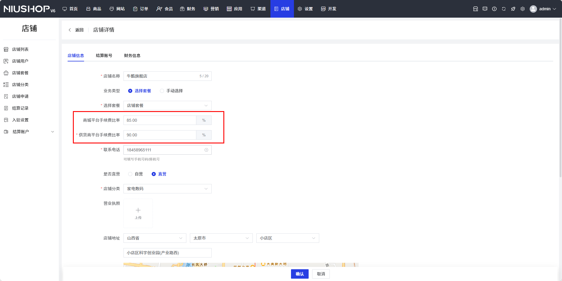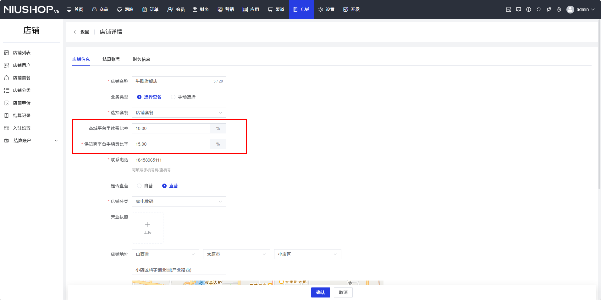 - 在店铺信息中设置商城平台/供货商平台手续费比率
