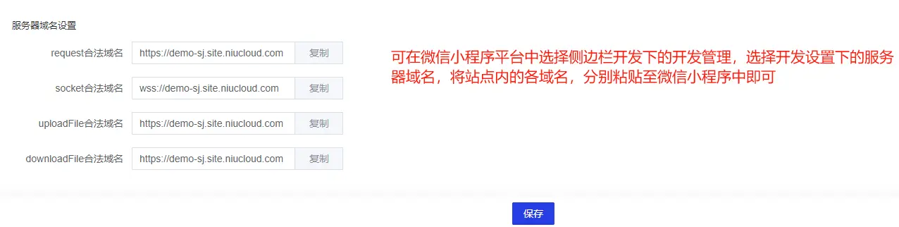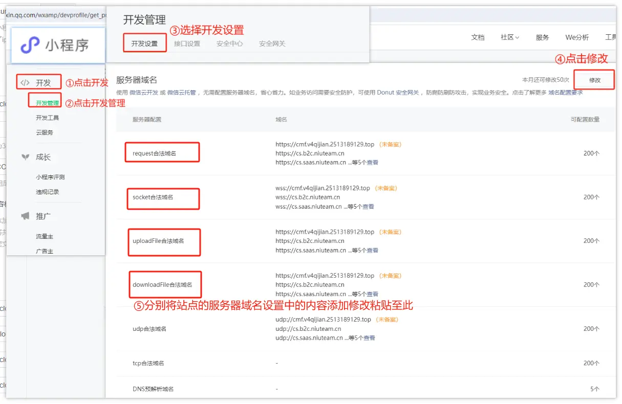 6.服务器域名设置 request合法域名、socket台法域名、uploadFile合法域名、downloadFile合法域名 ,可在微信小程序平台中选择侧边栏选择开发选择开发管理,选择开发设置下的服务器域名,将站点内的各域名,分别粘贴至微信小程序中即可