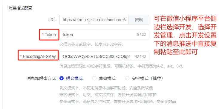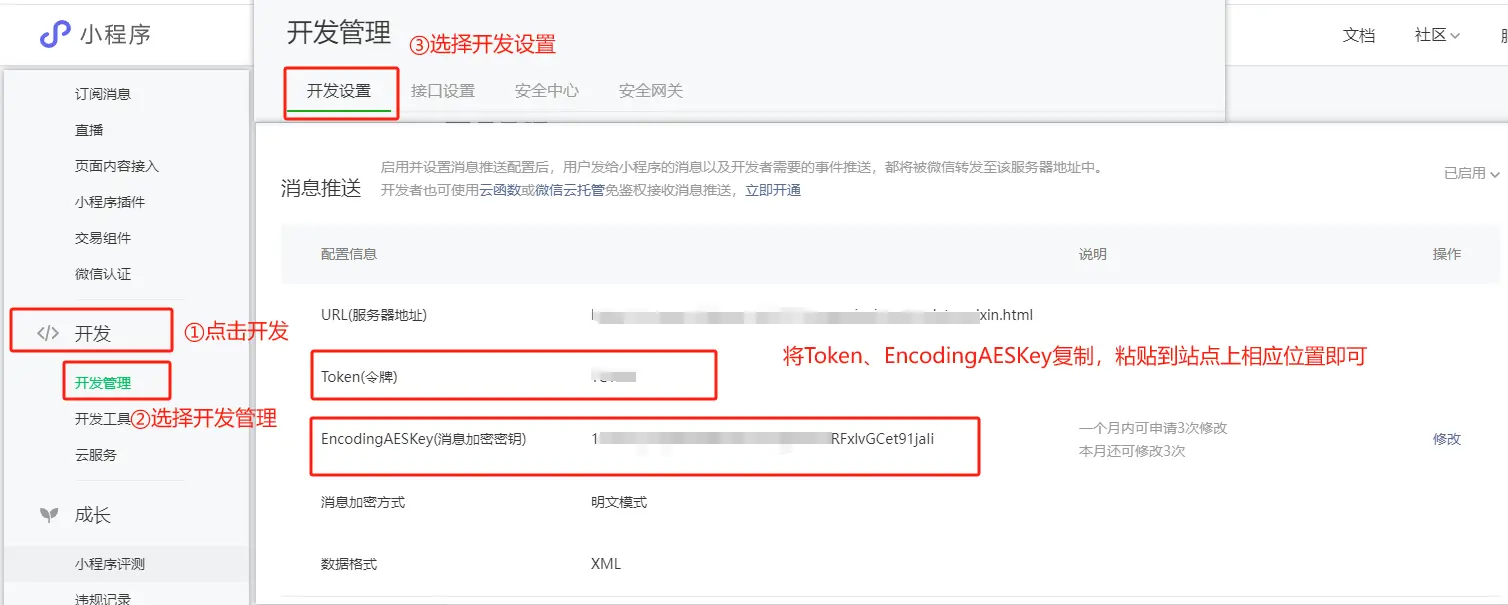 5.消息推送配置 Token、EncodingAESKey和可在微信小程序平台侧边栏选择开发,选择开发管理,点击开发设置下的消息推送中直接复制粘贴至此即可