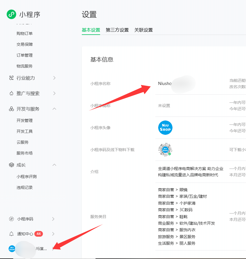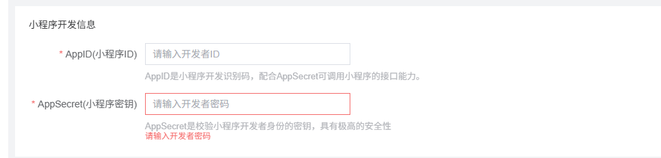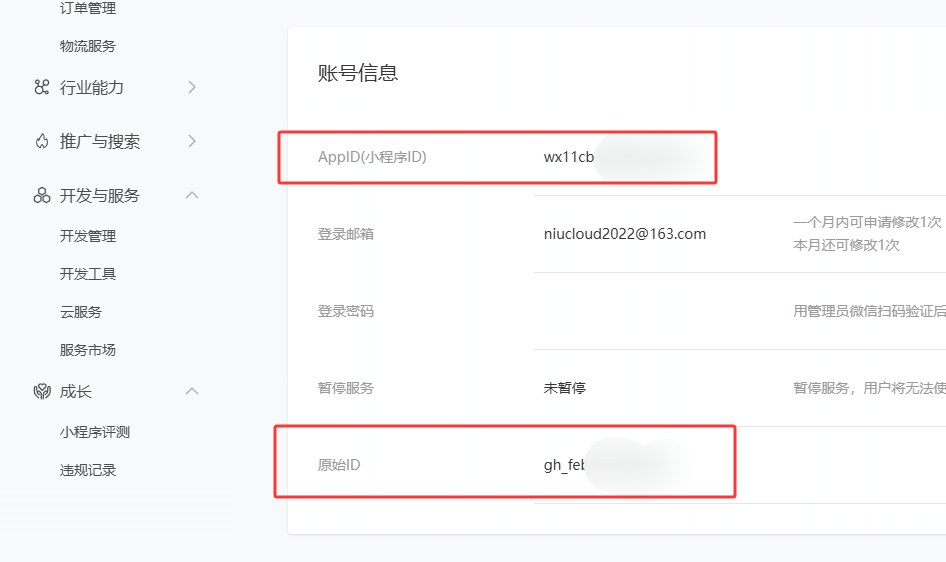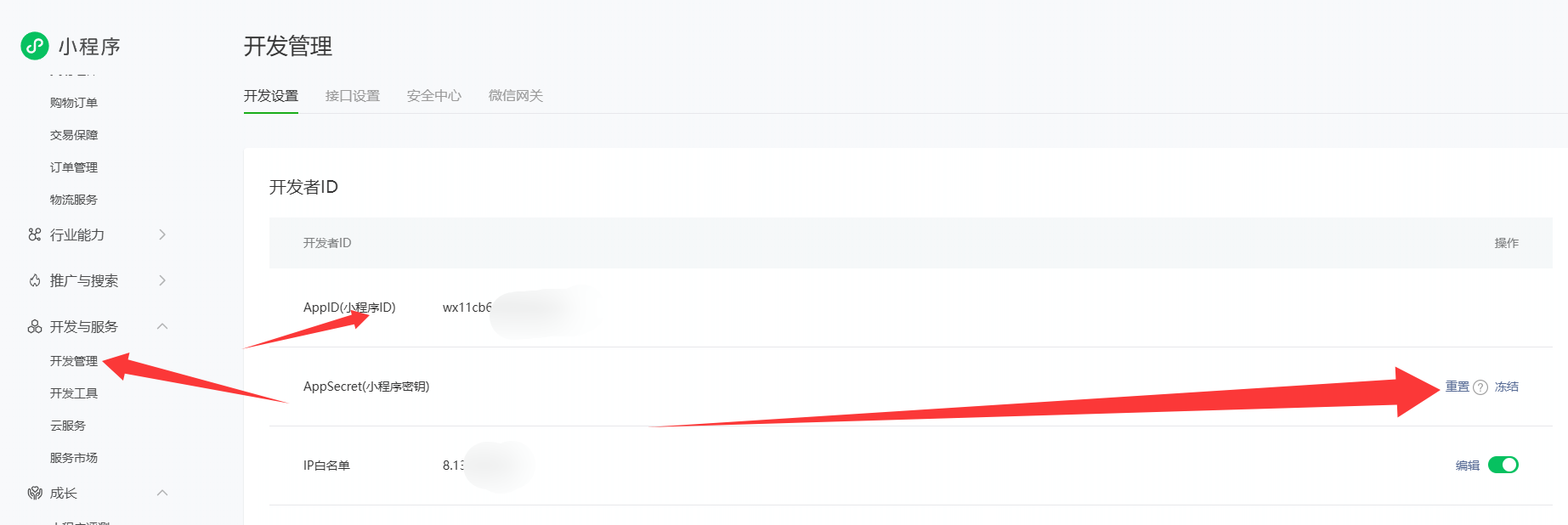3.小程序开发信息 AppID和小程序密钥可在微信小程序平台中,点击侧边栏开发,点击开发管理,在开发设置中的开发者ID可获取到